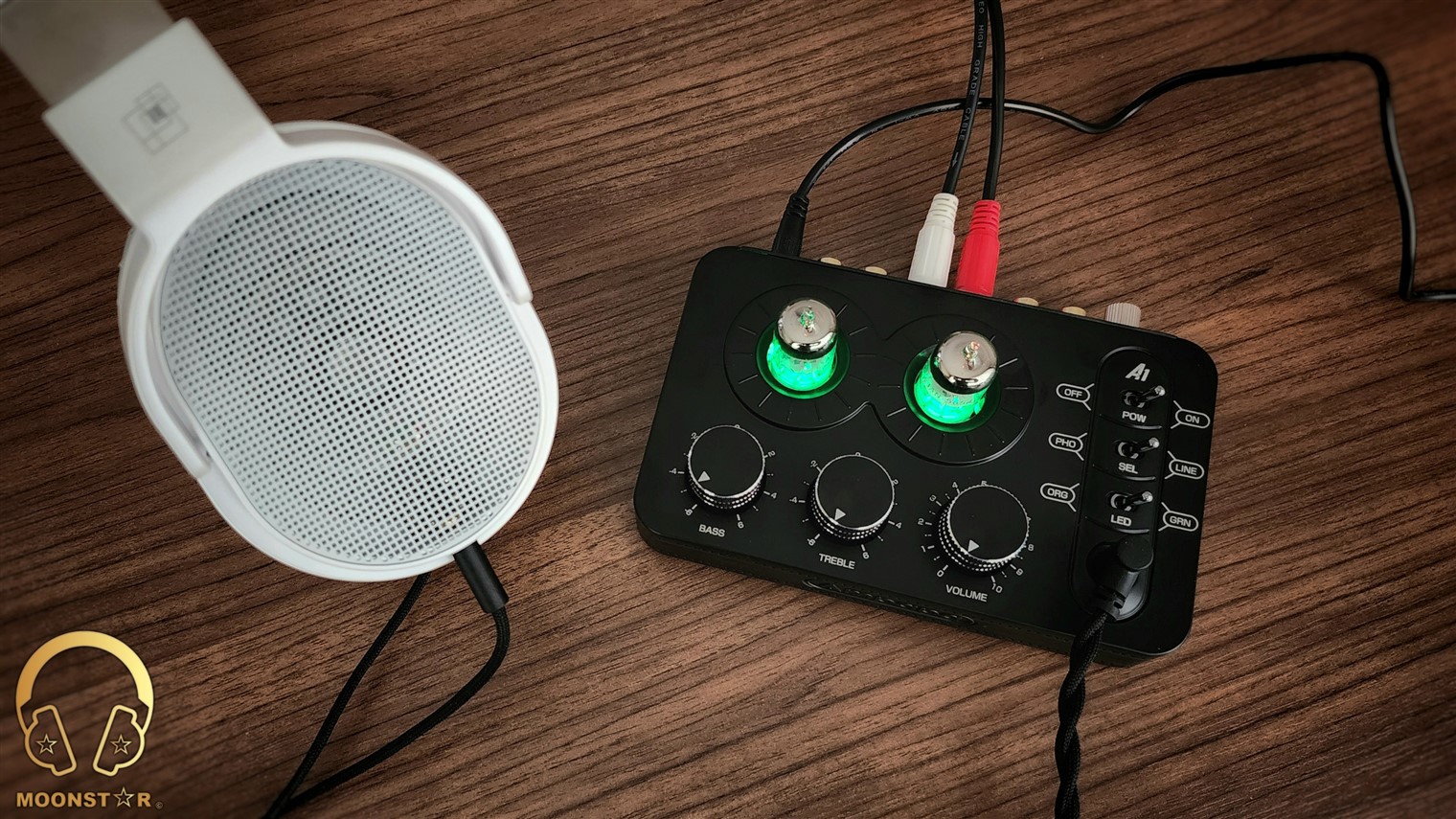 On the top of the Ampapa A1 are 3 dials (volume, bass, treble), 3 switches (power on/off, select, led) 2 female sockets for the vacuum tubes, and the 3.5mm headphone output.