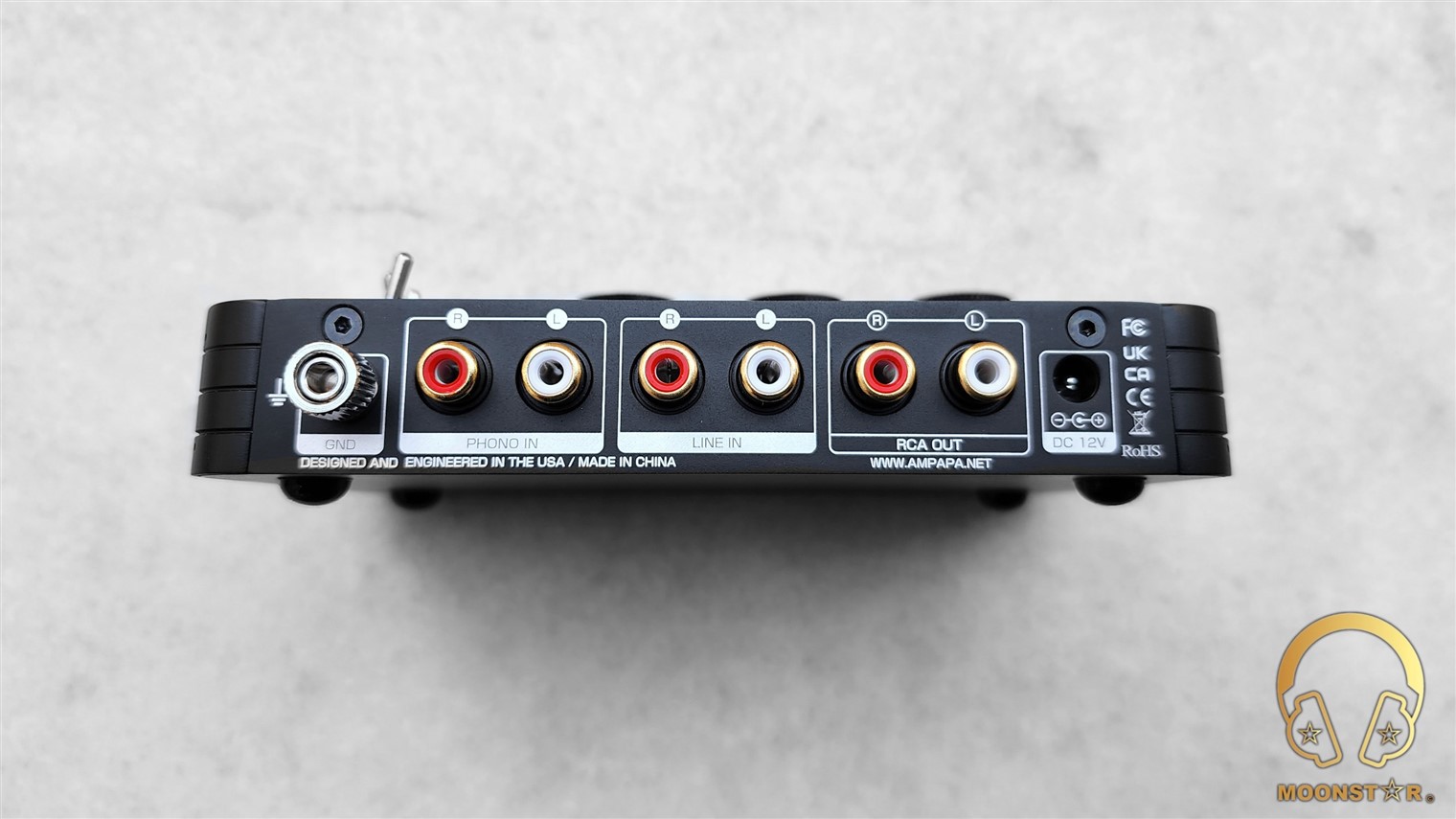 The rear side of the device sports from left to right the GND (ground) connector for turntables, left/right phono inputs, left/right line inputs, left/right RCA outputs and the 12V DC power input and some industrial certifications (CE, FCC,RoHS, etc.)