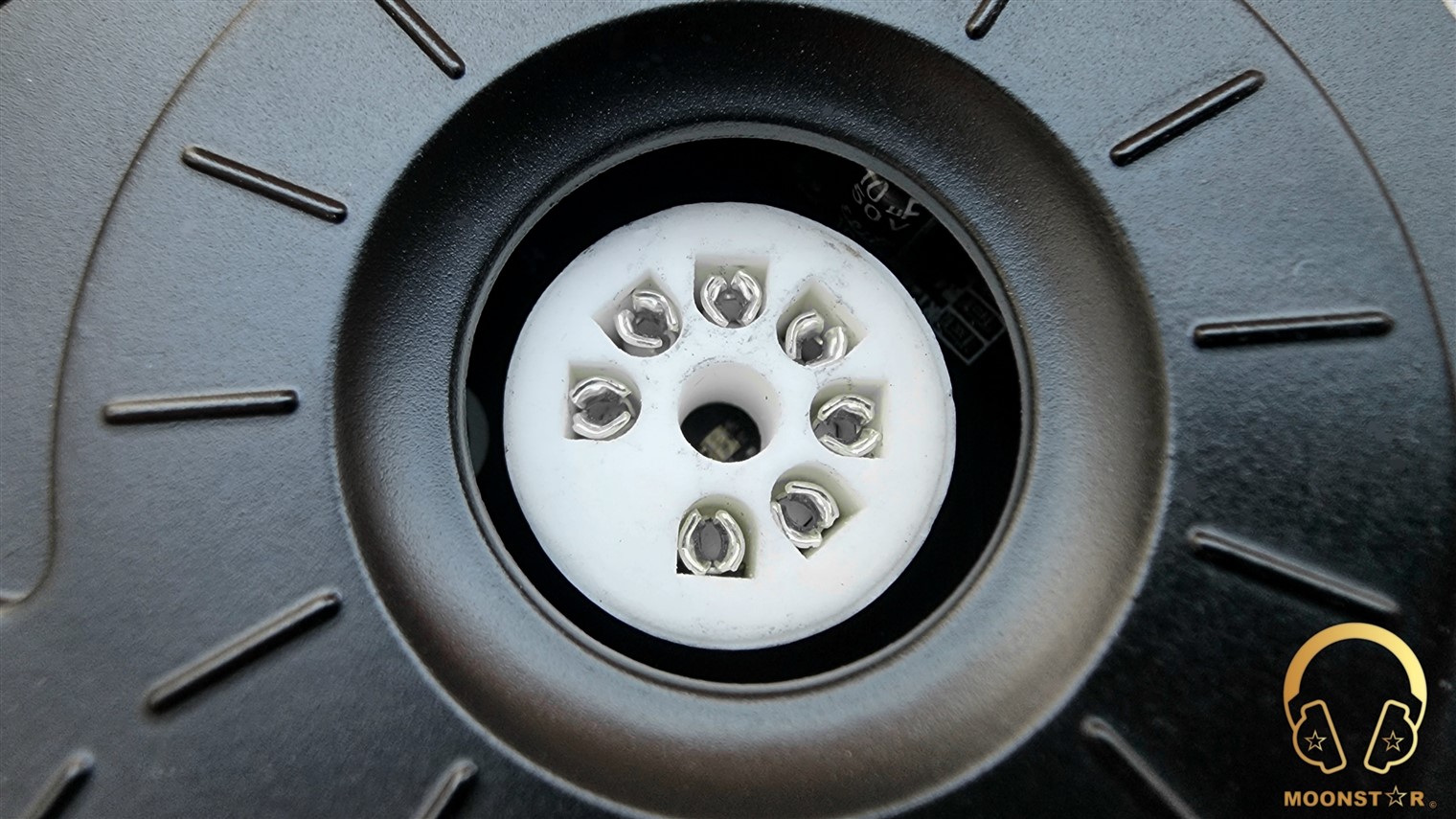 The 3 switches on the top do remind me to the ones mainly used in plain and helicopter cockpits. The first switch is for power on & off; the second one is to select between Phono and Line-in. The third switch allows you to choose between the orange and green LED color of the tubes and the lights that do surround the device, which can be completely turned off by positioning it to the middle. The Ampapa A1 offers only a 3.5mm Single Ended output that is located nearly he switches.
