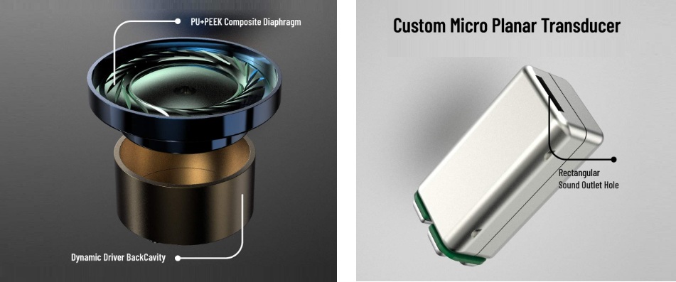 The Frost features a 10mm dynamic driver designed for robust audio performance. This driver consists of a carefully constructed diaphragm made from PEEK and PU materials, which contribute to its durability and effective sound reproduction across various frequencies. In addition to the dynamic driver, the Frost incorporates a micro planar transducer that combines traditional planar driver principles with a compact design. This transducer features a rectangular sound outlet hole, which offers better dispersion and absorption characteristics for specific frequency ranges.