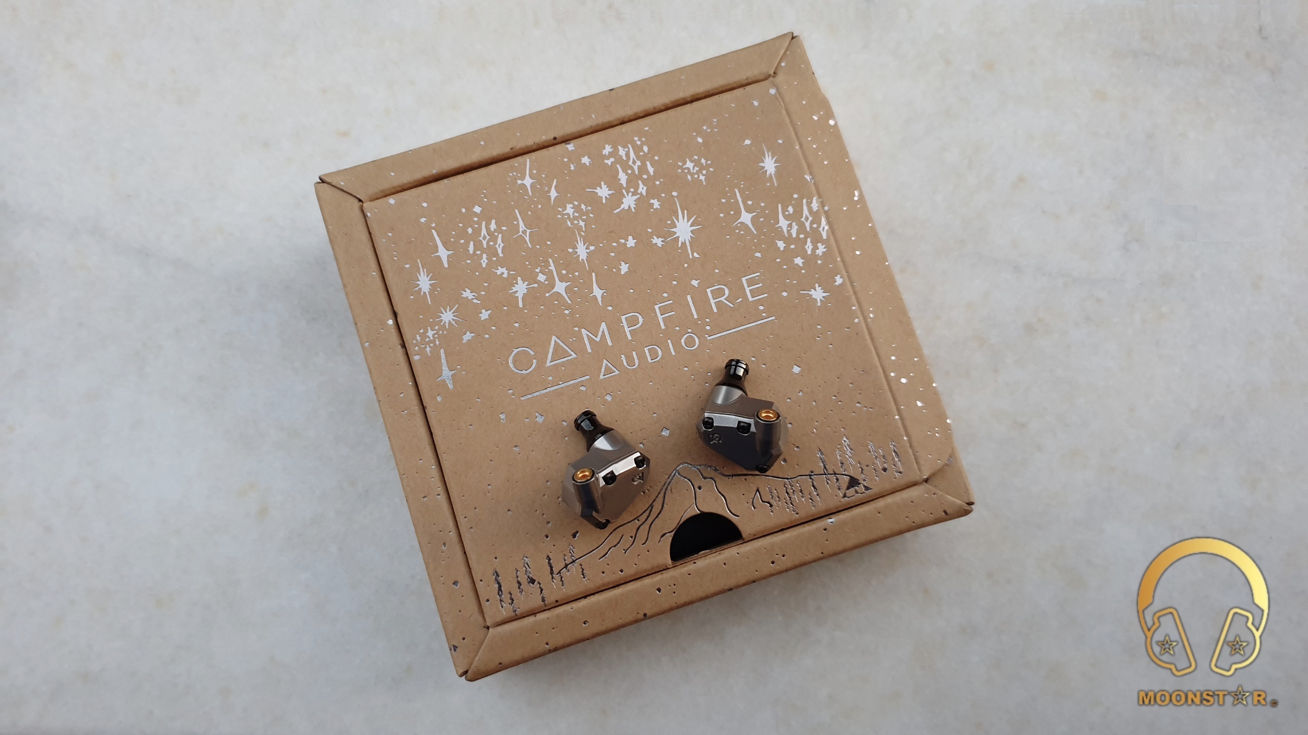 The box itself is made from the same cardboard material with the Campfire Audio logo on the top in silver color, set in a scene between a sky full of stars and a mountain surrounded by trees that could represent the nature of Oregon where the company is located.