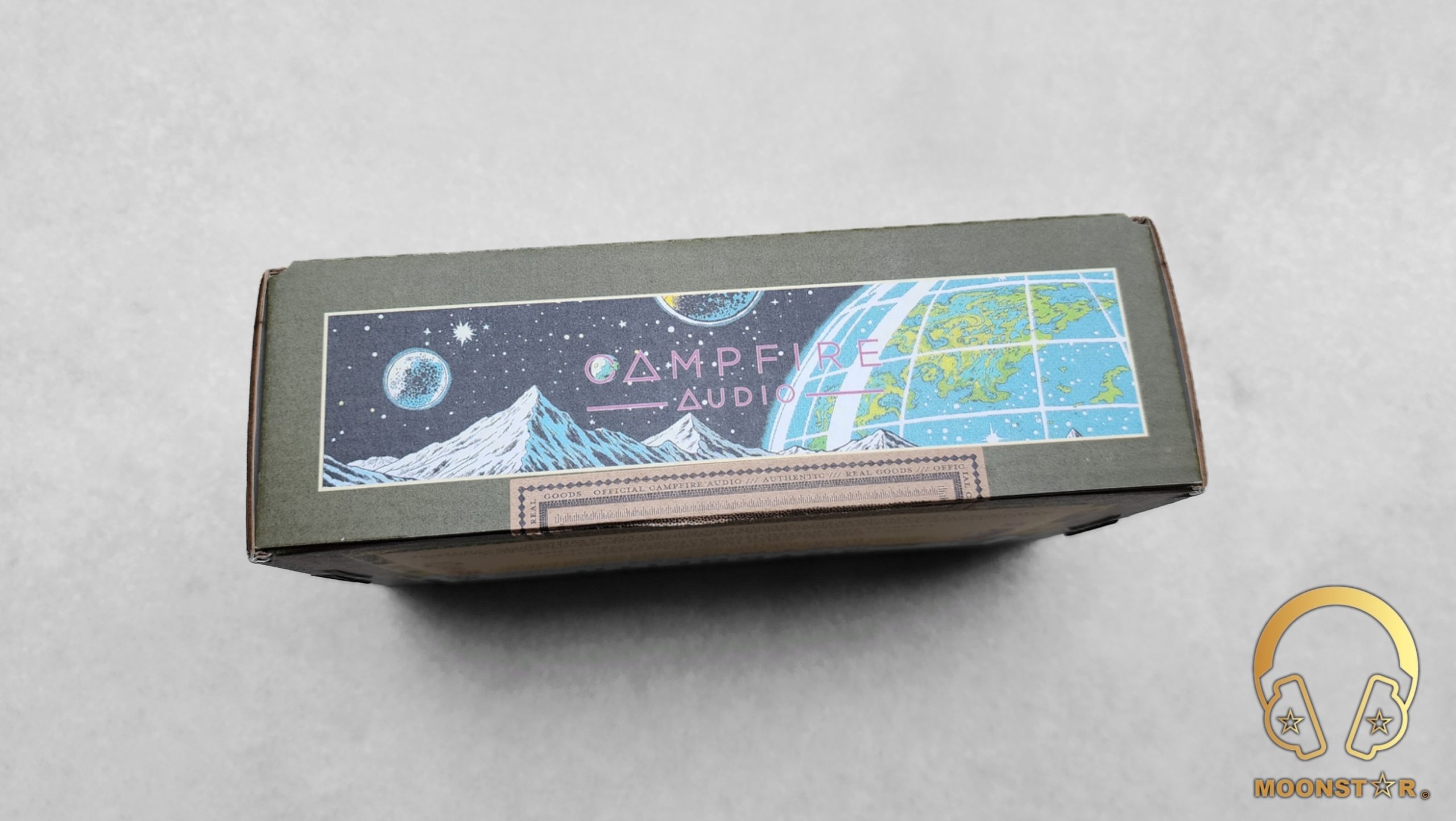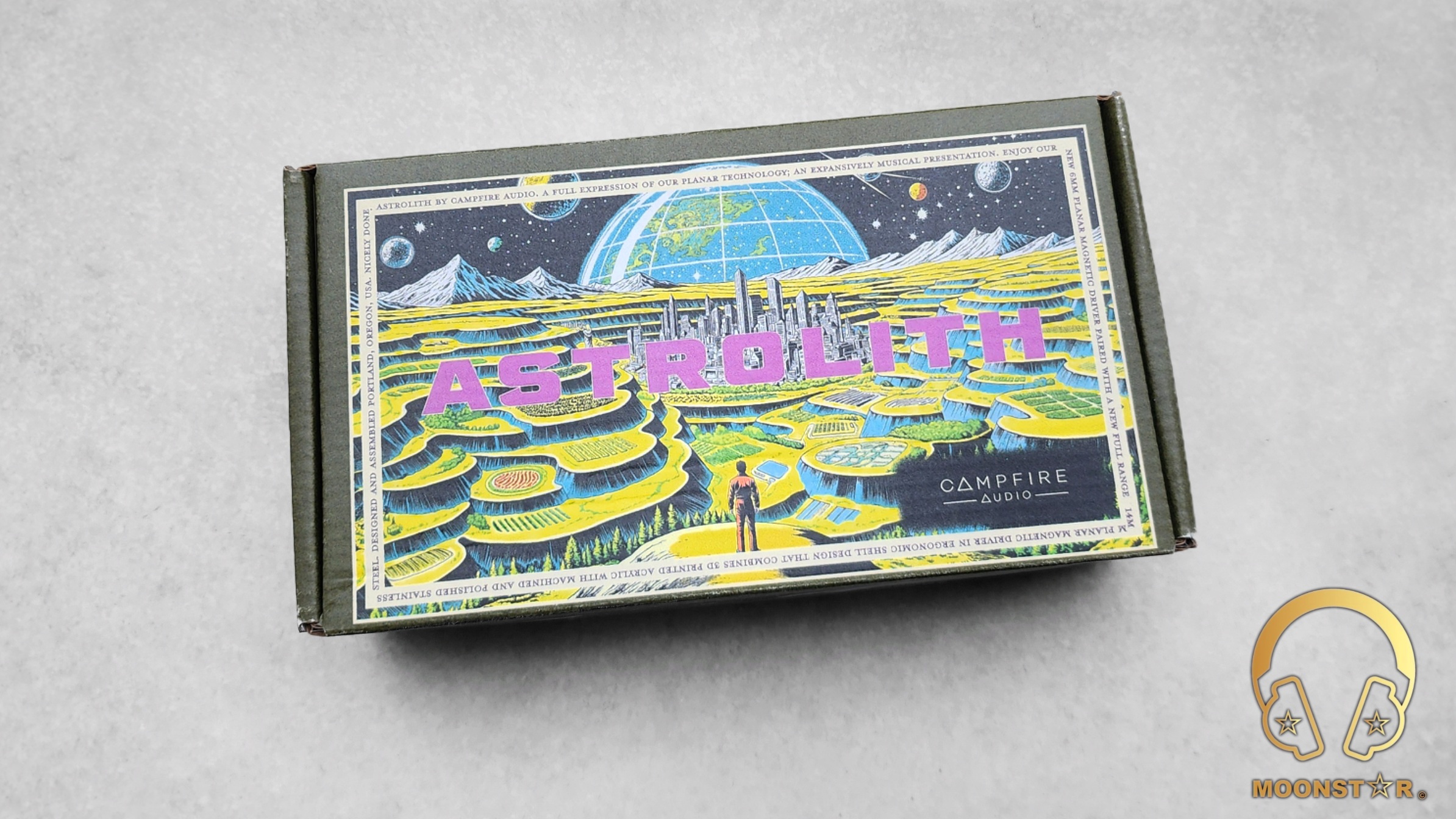 The Campfire Audio Astrolith arrives in a visually captivating box. The packaging is made of sturdy cardboard and features a deep green hue, complemented by a retro-futuristic illustration of a lone explorer on an alien world. This design creates a sense of wonder and mystery. The bold, futuristic font for the product name adds to the overall aesthetic, setting high expectations for the innovative technology inside.