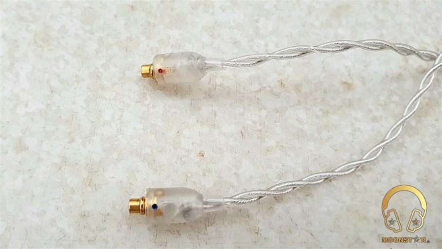 This cable has beryllium copper MMCX (Micro Miniature Coaxial) male connectors and sports a gold plated, right angled 3.5mm 3 Pole (TRS single ended) headphone jack with a semi transparent plastic housing.