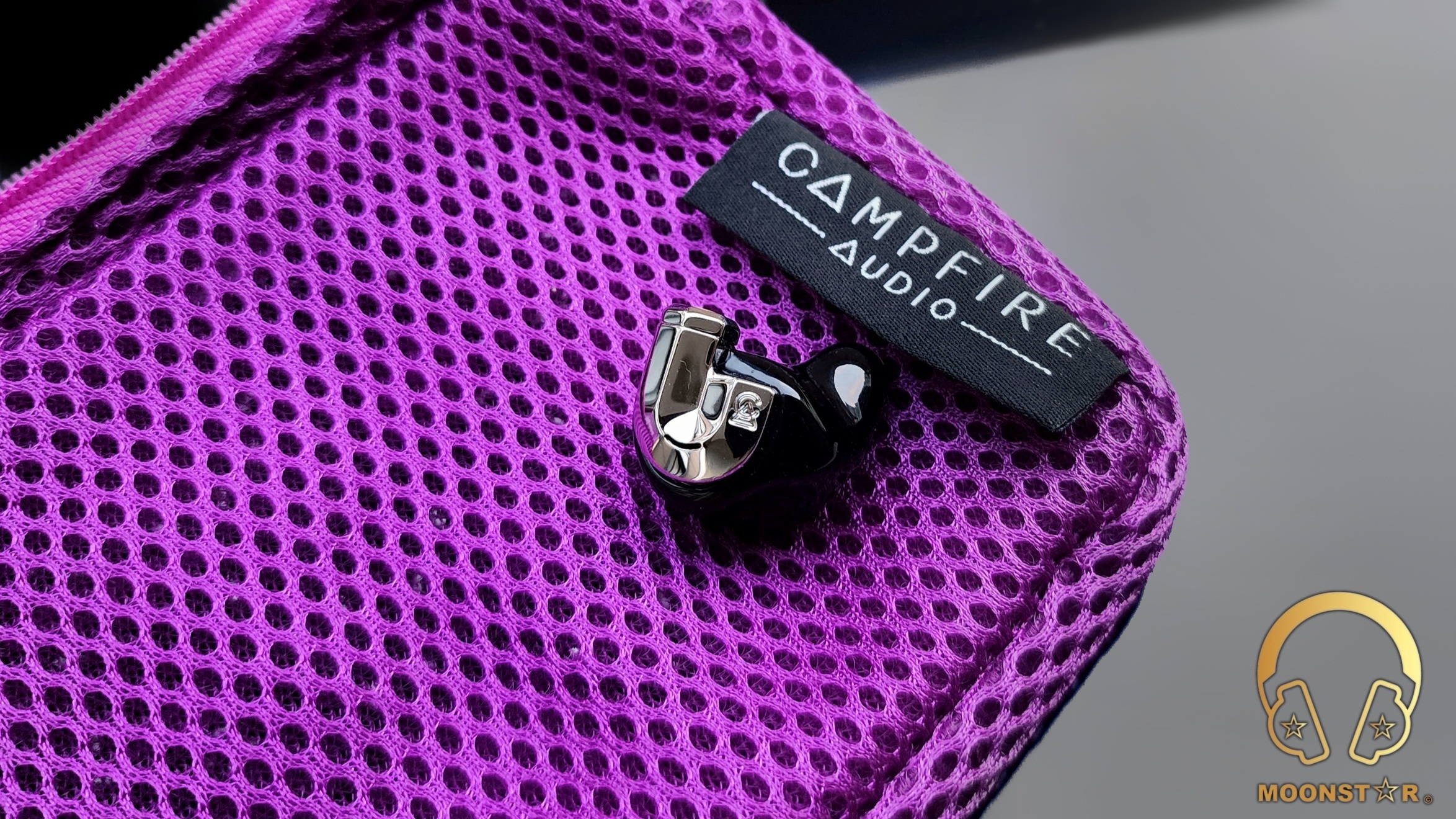 On the front of the monitor is the polished stainless steel faceplate with an artistic “J Shaped” design that sports the Campfire Audio brand logo and a pressure relief opening.