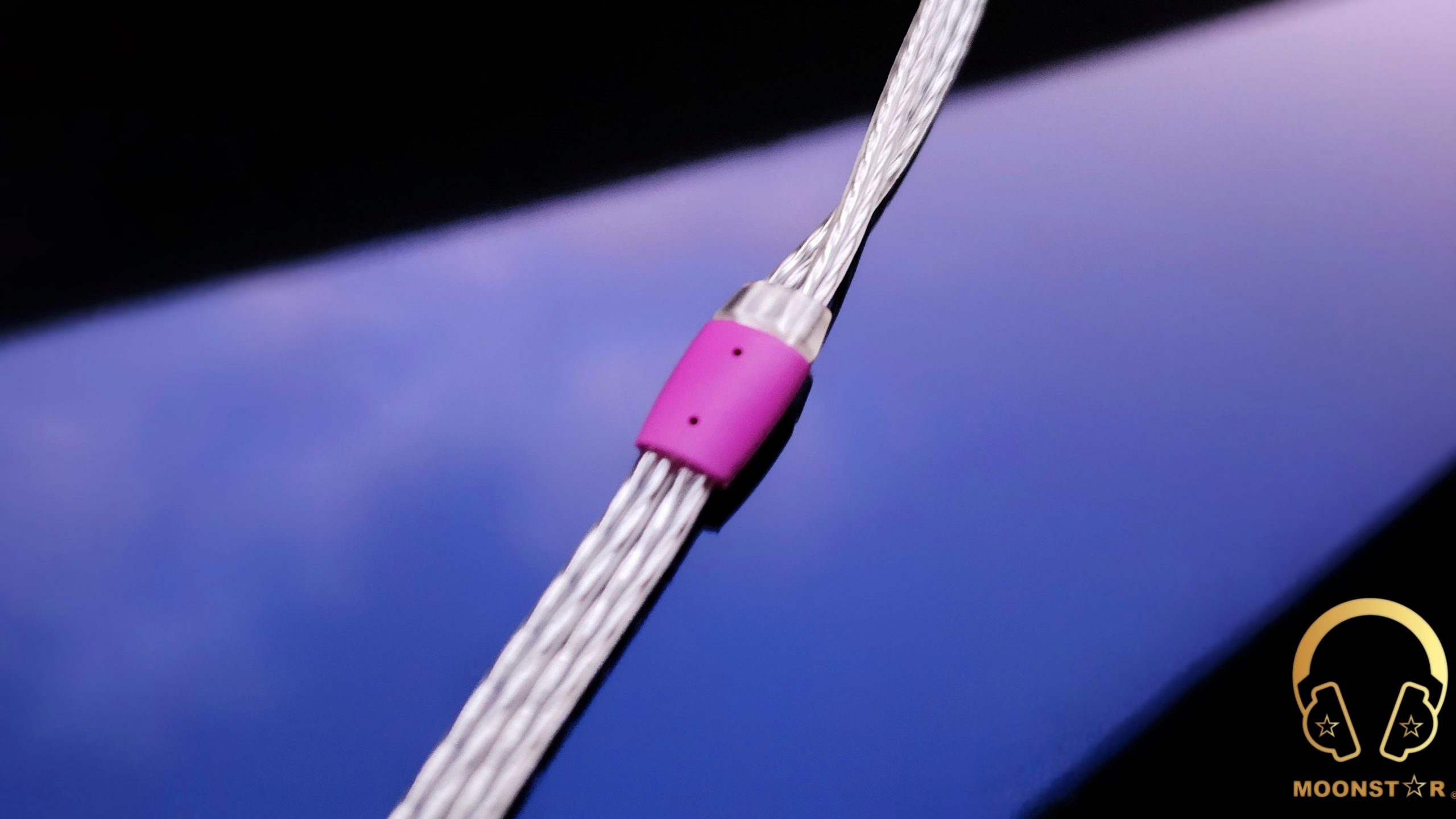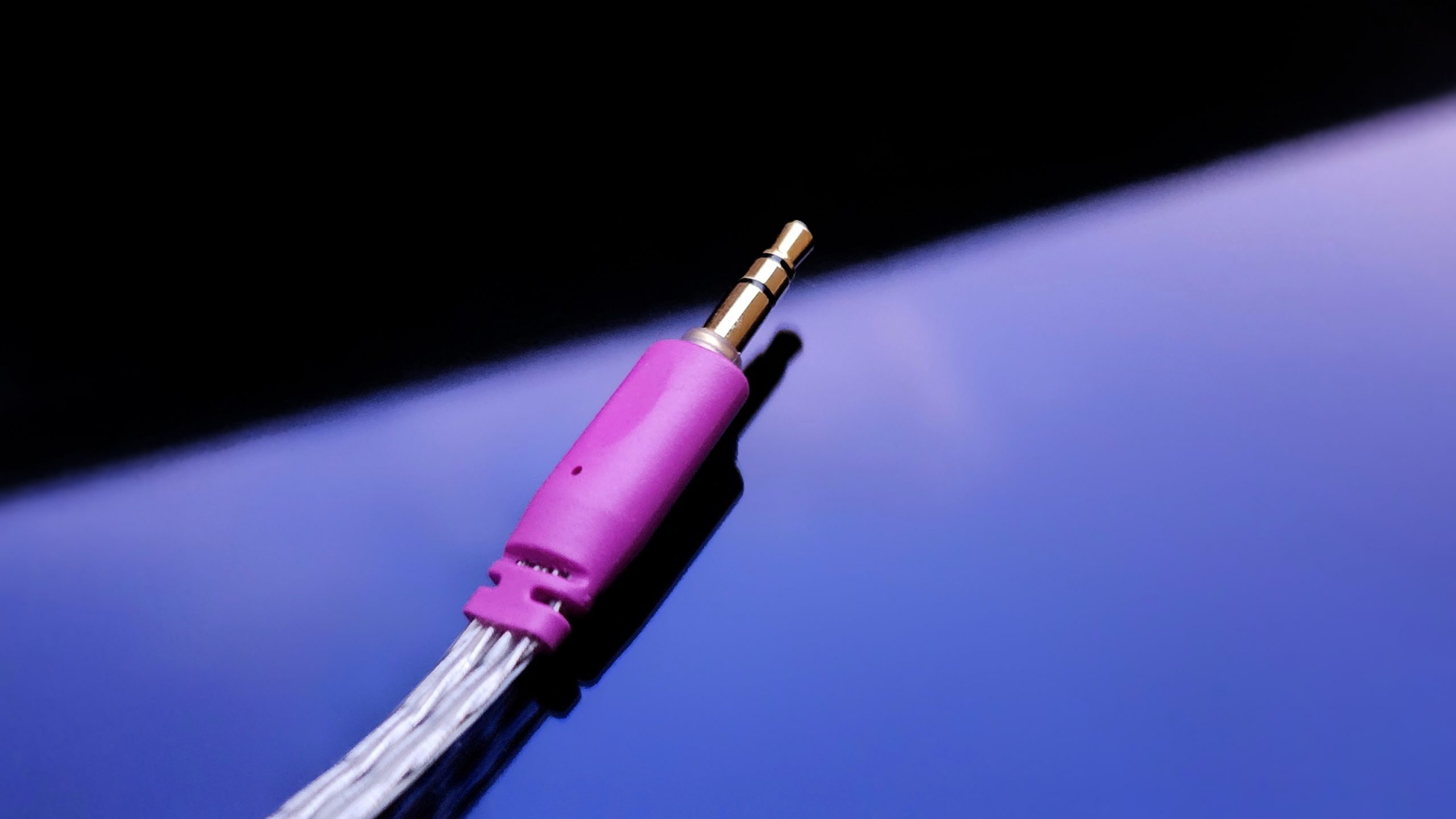 The cable has a straight-profiled headphone housing with a retro-inspired design, crafted from the same purple plastic as the rest of the cable.