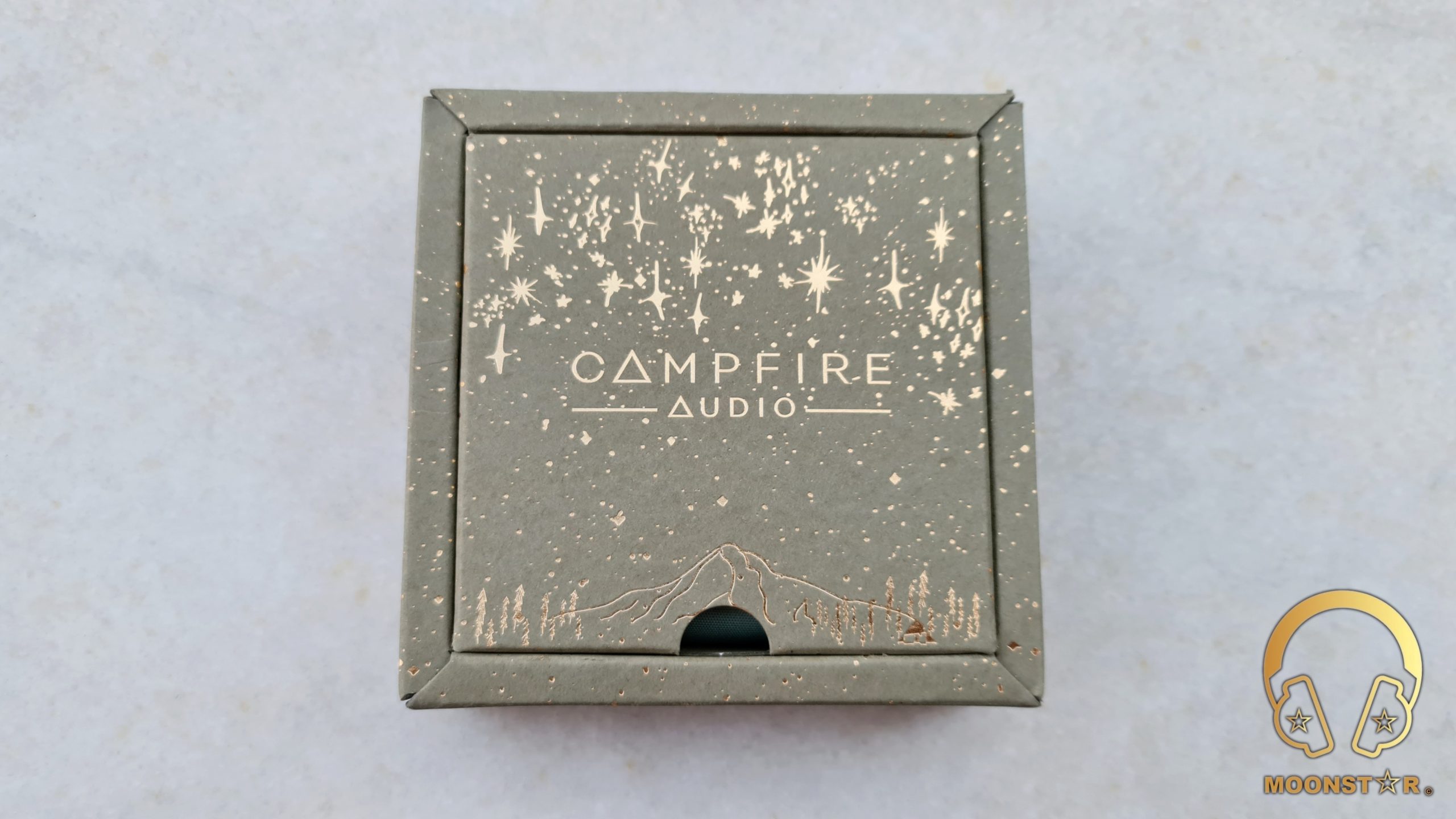 The box itself is made from the same cardboard material in “Pale Green” color that has the Campfire Audio logo on the top in gold color, set in a scene between a sky full of stars and a mountain surrounded by trees that could represent the nature of Oregon where the company is located.