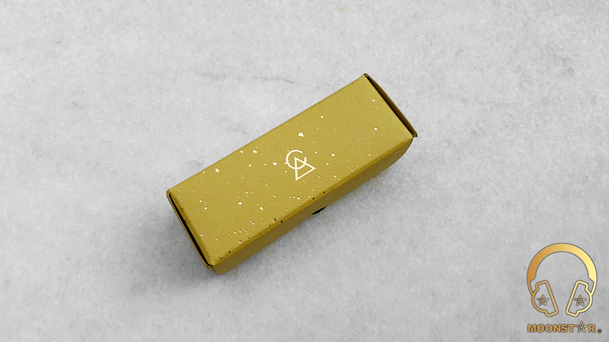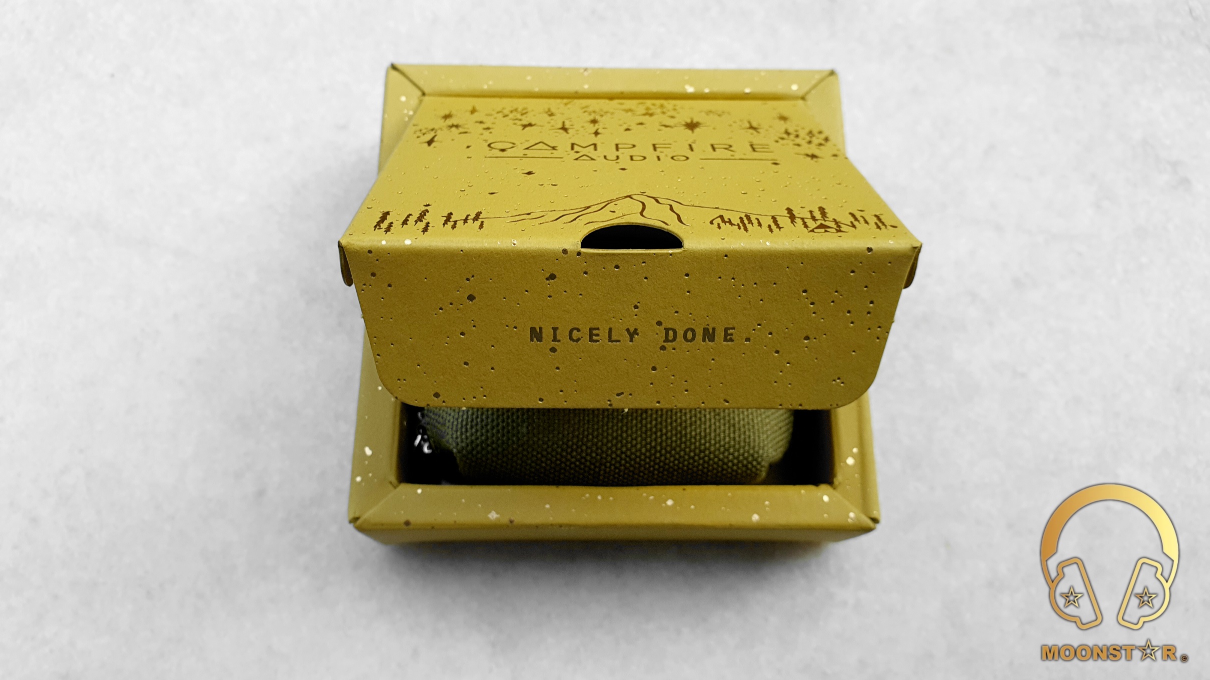 The main box is of USA made cardboard from the “French Paper Company” that is in khaki/olive color. This box sports the Campfire Audio logo on the top in gold color, set in a scene between a sky full of stars and a mountain surrounded by trees that could represent the nature of Oregon where the company is located.