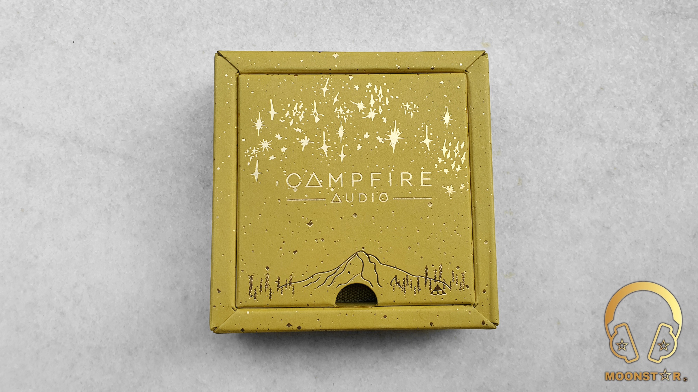The main box is of USA made cardboard from the “French Paper Company” that is in khaki/olive color. This box sports the Campfire Audio logo on the top in gold color, set in a scene between a sky full of stars and a mountain surrounded by trees that could represent the nature of Oregon where the company is located.