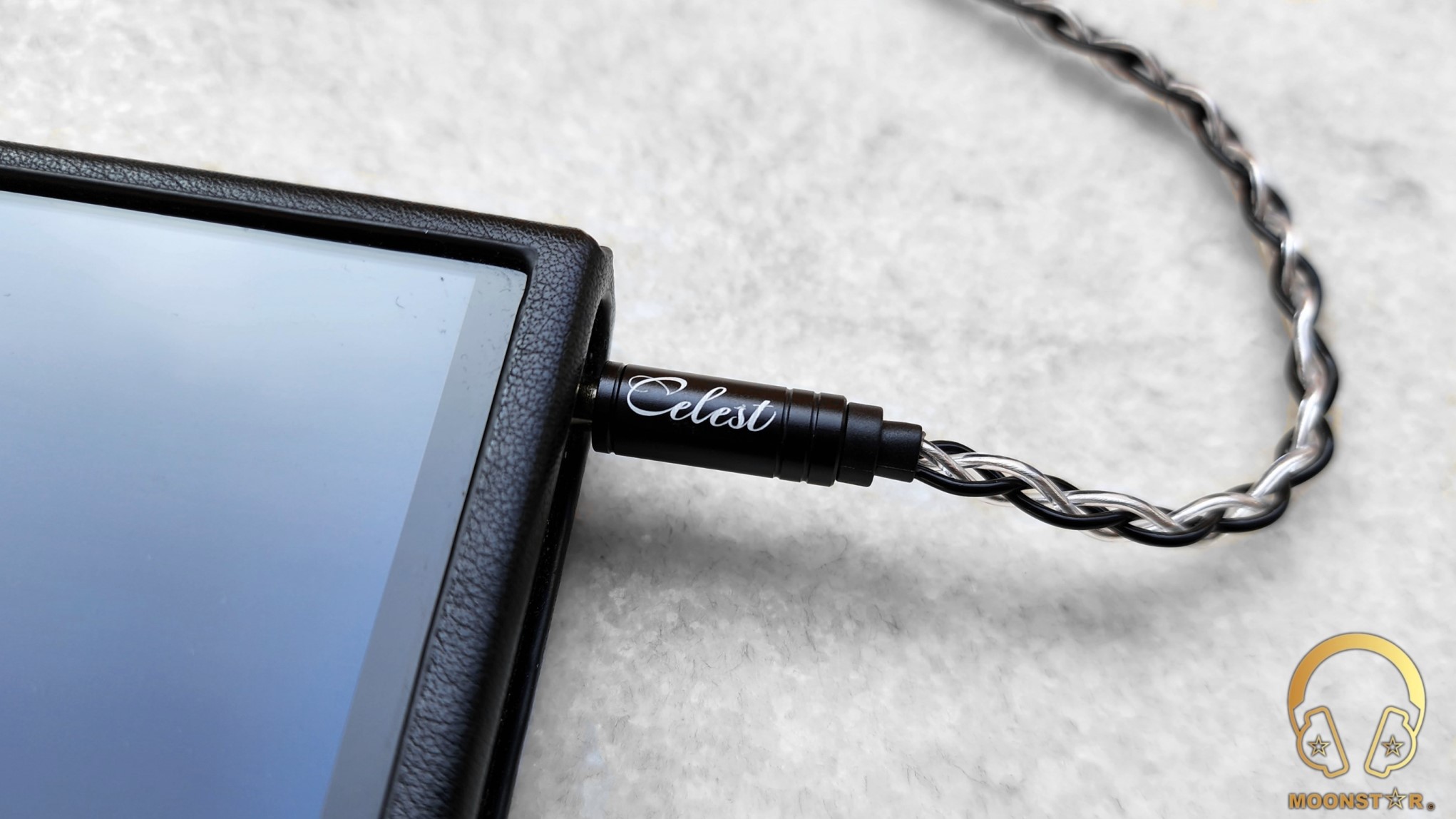 The 3.5mm Single Ended headphone plug has a strait profiled metal housing in black with a with the Celest branding in while color on its surface.