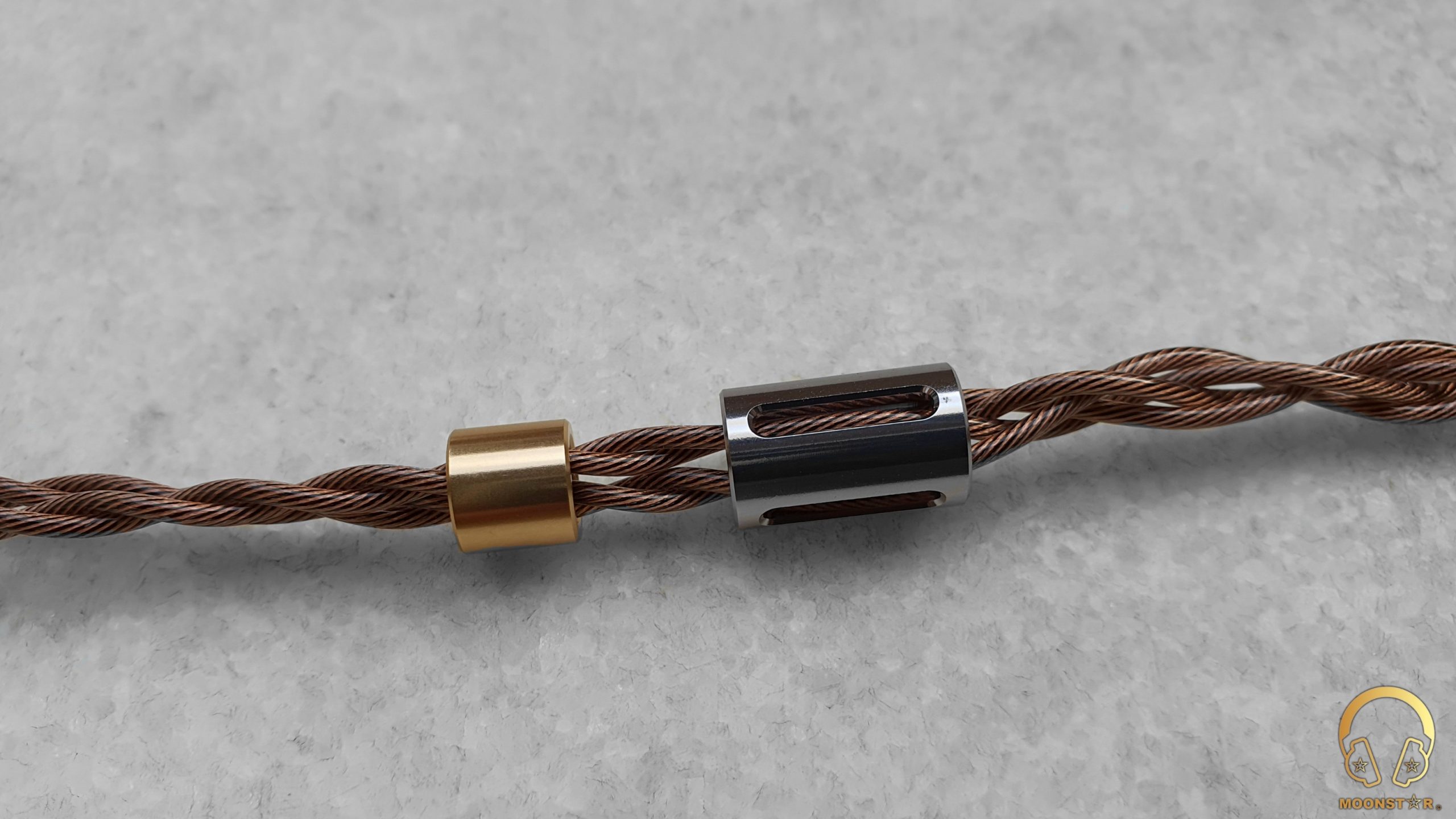 The Air Nyx (BC130B) OCC upgrade cable has a very stylish y-splitter and chin slider design. The y-splitter has a silver polishes finish, while the chin slider seems made from messing material, which is in cold color.