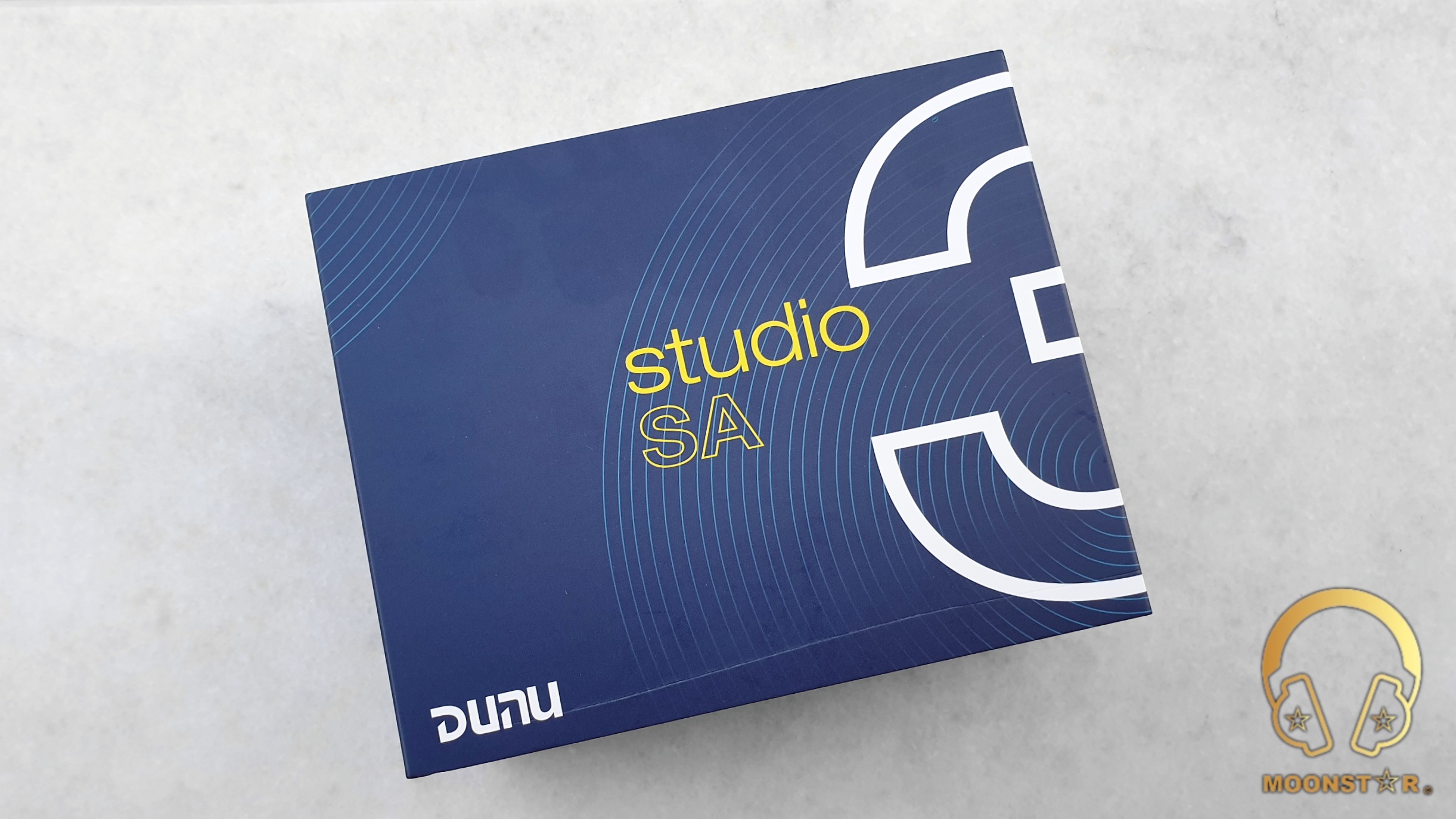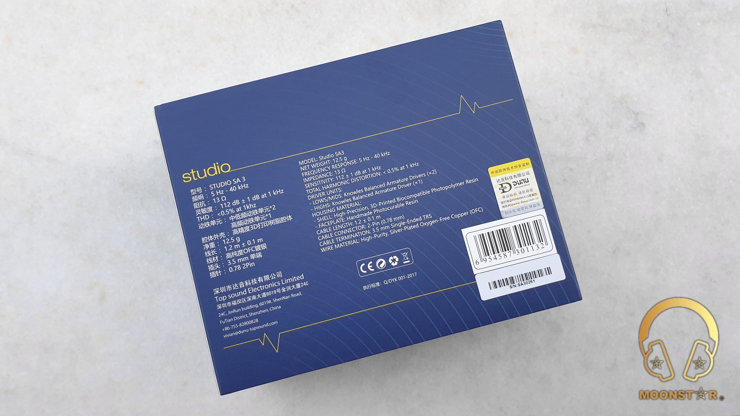 The DUNU SA3 came in a pretty robust box in black color with the classical silver DUNU brand logo. This box has a cardboard sleeve in blue color which shows some product brandings on the top and some product specific details at the rear side.
