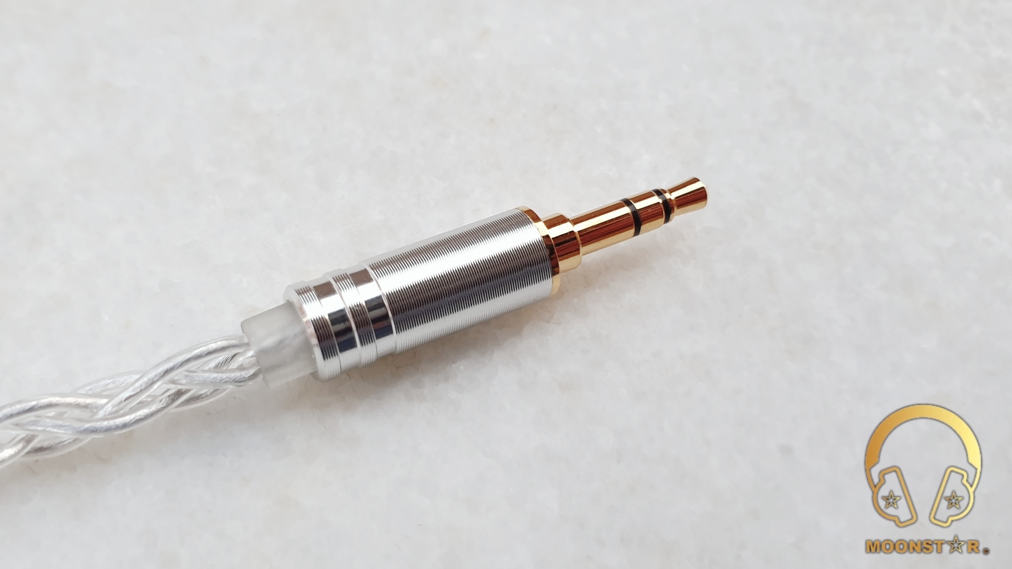The 3.5mm TRS (unbalanced) headphone jack has a straight profiled metal housing in sliver color with a transparent plastic strain relief for extra protection.