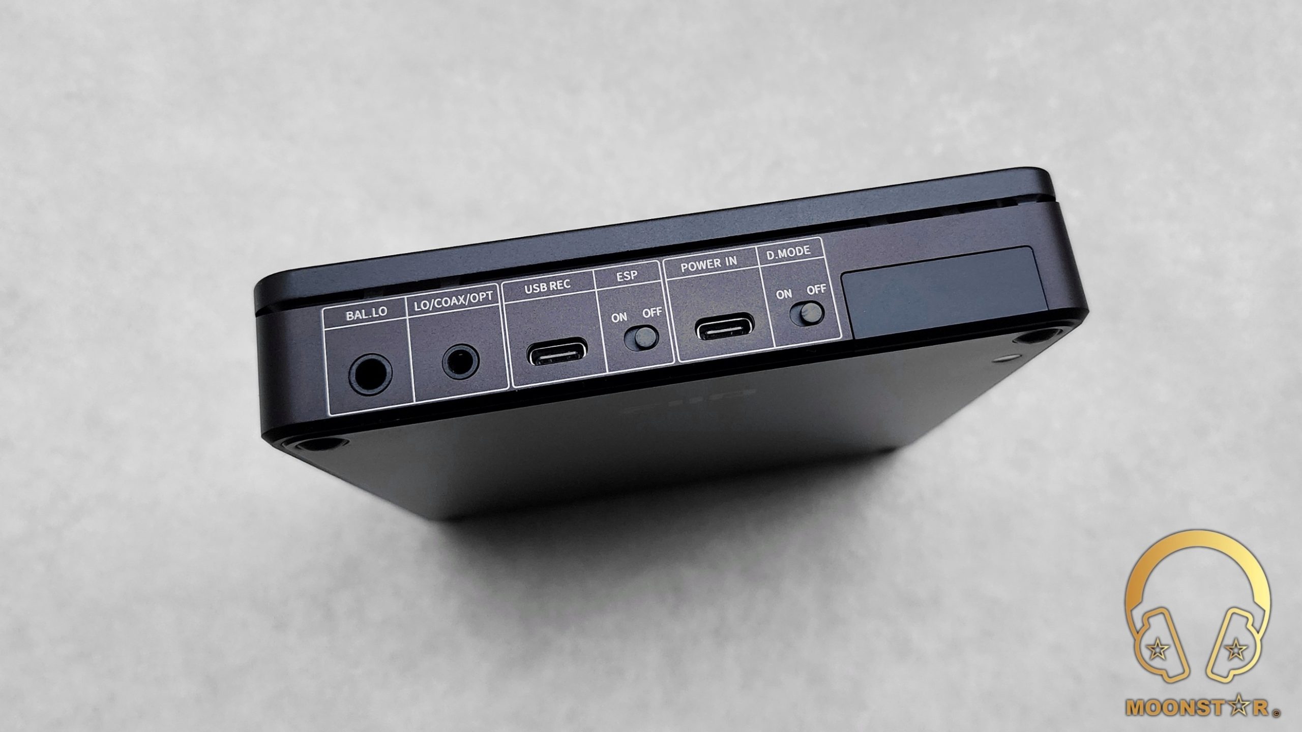 The rear surface includes various connection ports and switches. These ports and switches are as follows: 4.4mm balanced LO, USB REC port, desktop mode (D.MODE) switch, 3.5mm LO/COAX/OPT combo output, ESP switch, and Type-C 5V power input. The 4.4mm balanced LO and the 3.5mm LO/COAX/OPT combo output can be used for connecting to active speakers or amplifiers, providing flexibility in setting up your audio system. These ports and switches enable the device to connect with various devices and perform multiple functions.