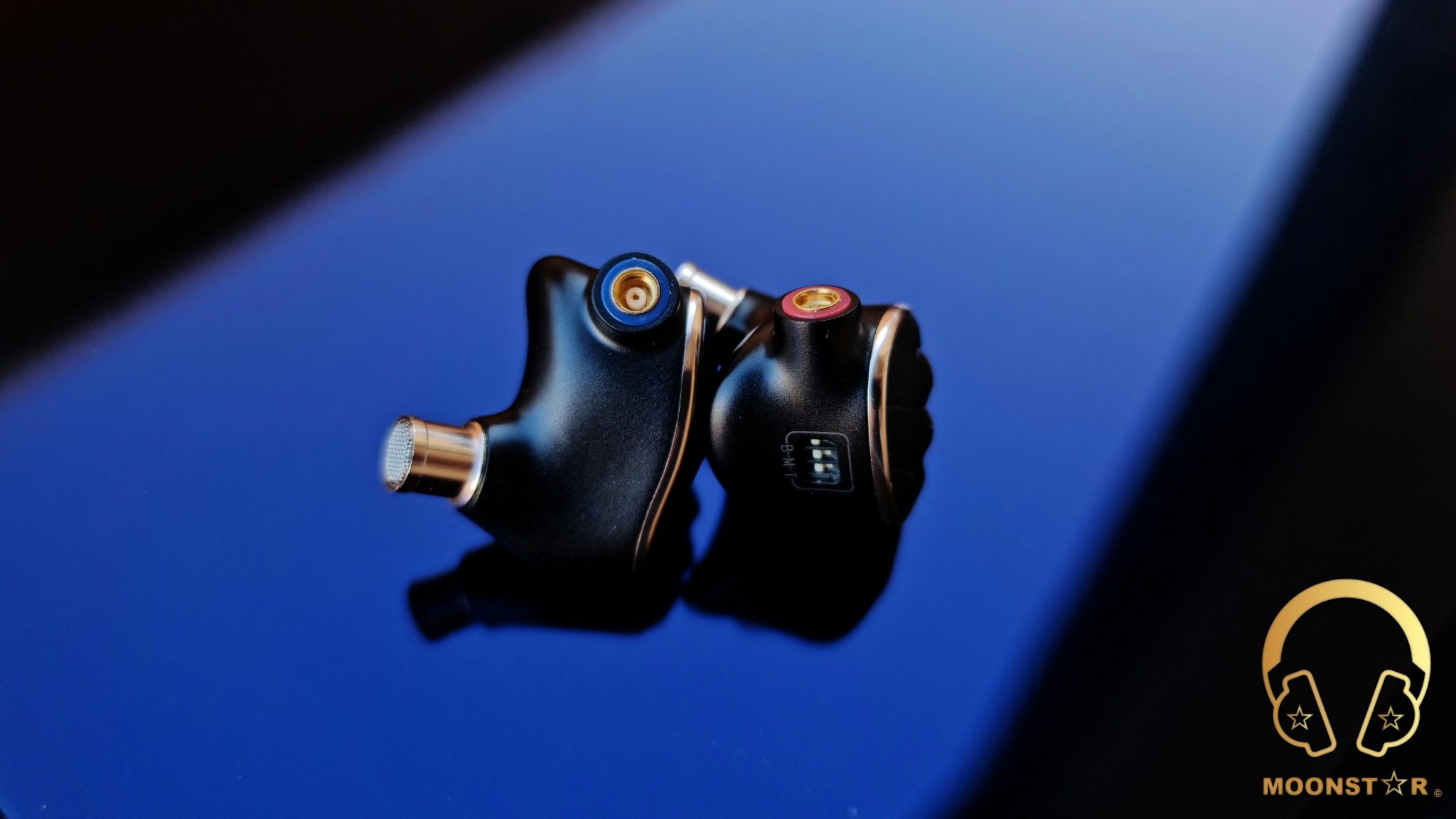 On the top of the monitor housing is the MMCX (Micro Miniature Coaxial) female connectors with left and right color indicators, which is in blue for left and red for the right connector.