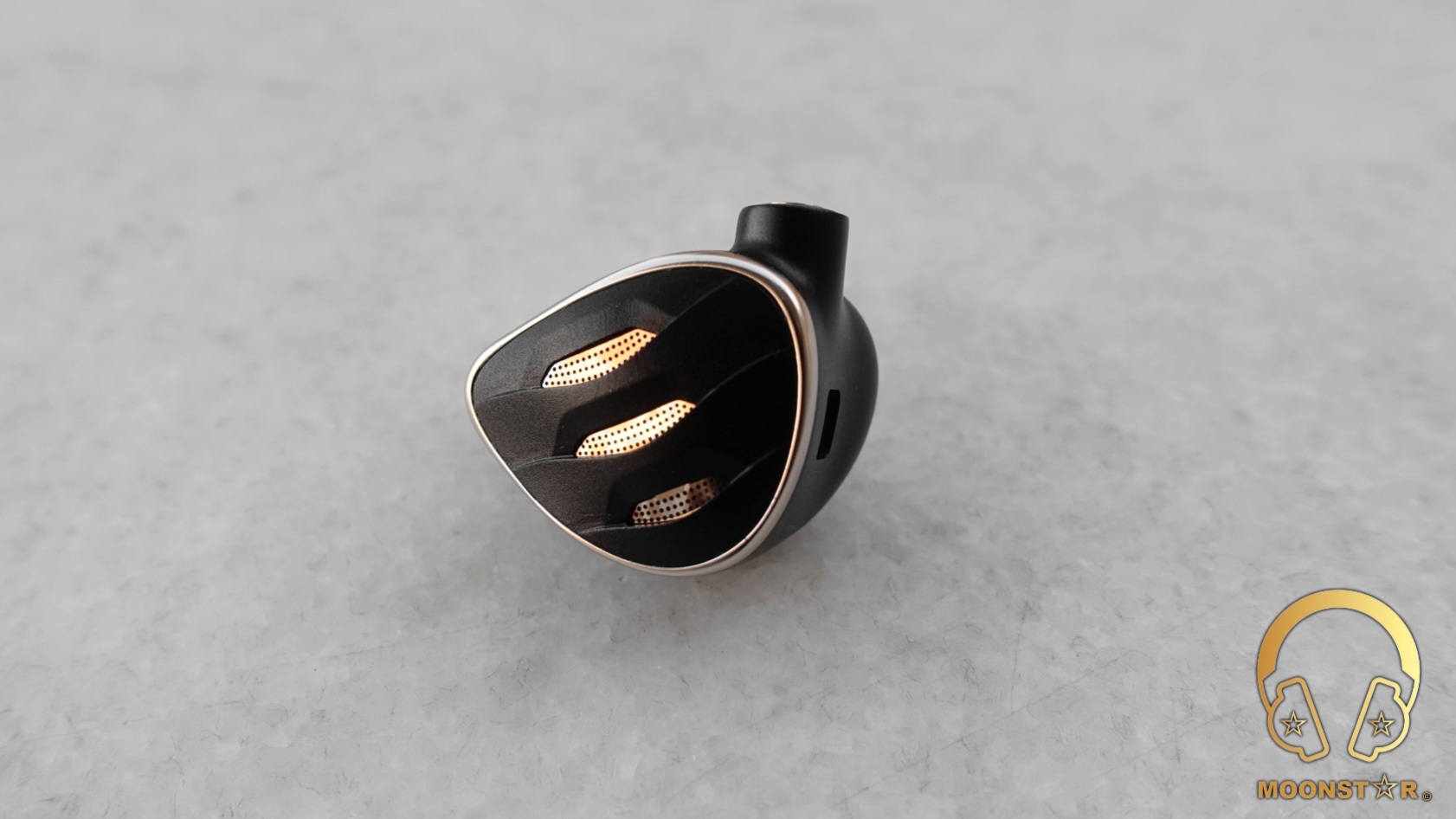On the front of the monitor shell is a unique looking “Dragon Scale” motive with a semi-open back design. The cavity was refined through computer simulations to ensure the air pressure at the front and rear cavities are balanced. The open-air mesh guides do blend the “Dragon Scales” nicely, which are in the same gold color like the metal frame around the faceplate.