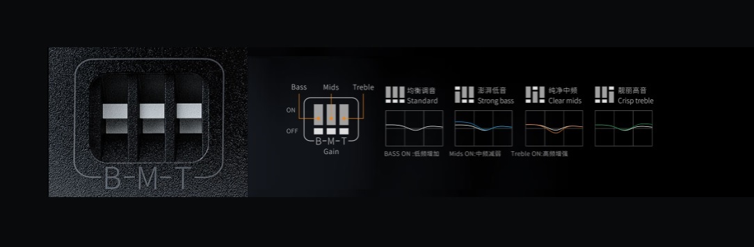 - B Switch On : Increase of Bass intensity, reduced Treble forwardness