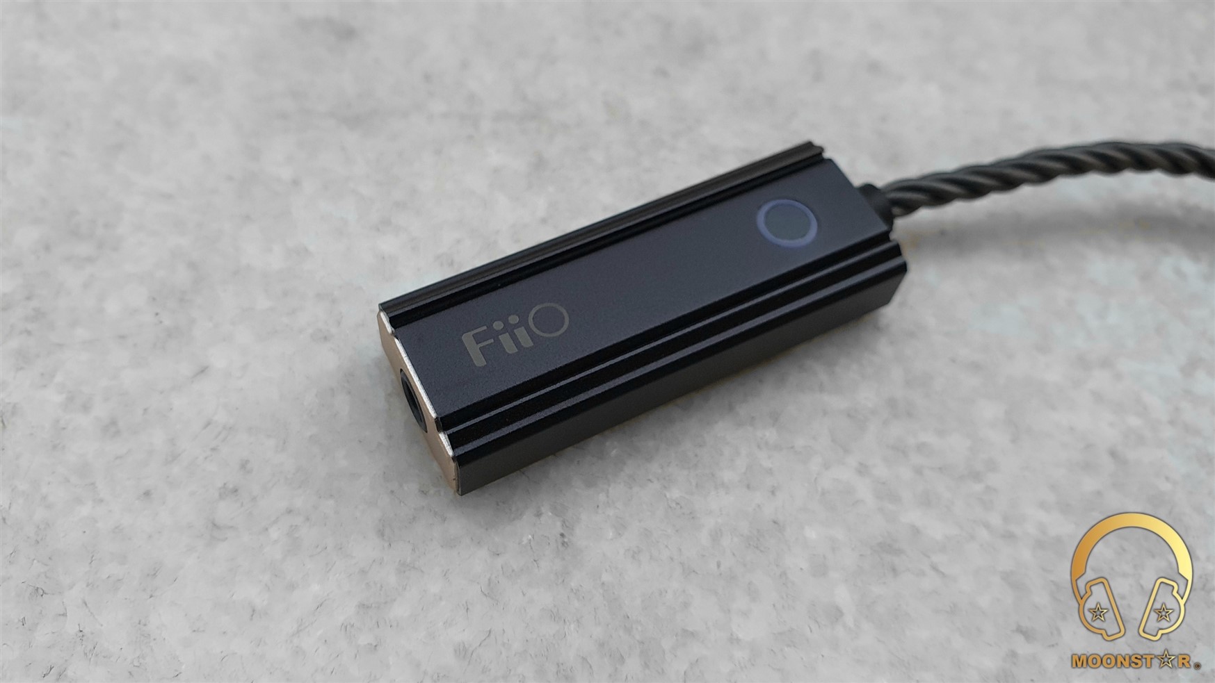 On the top surface of the device is the FiiO branding and a small LED indicator in form of a small ring that gives information’s about the actual sampling (Blue, Red, Green, Magenta).