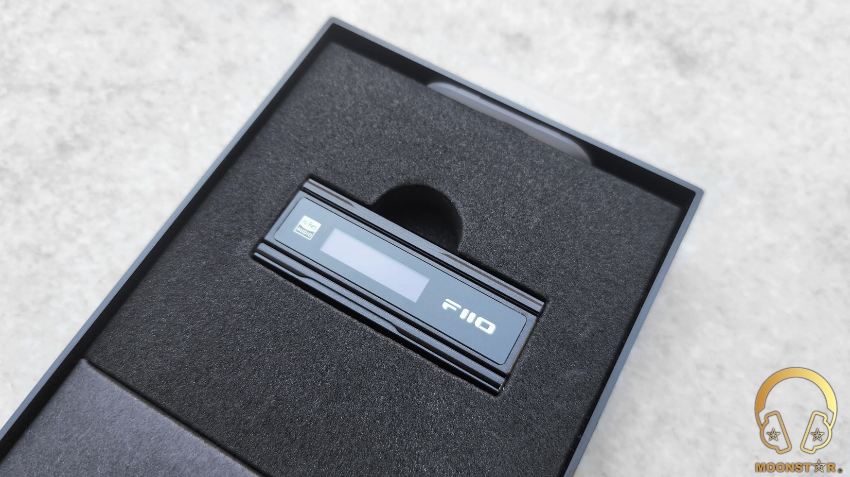 The FiiO KA5 comes inside a relative small rectangular box that is wrapped with a fancy looking cardboard sleeve that reflects the company’s new package design. It shows the illustration of the device and some branding (Hi-Res, MQA, ESS) on its surface.