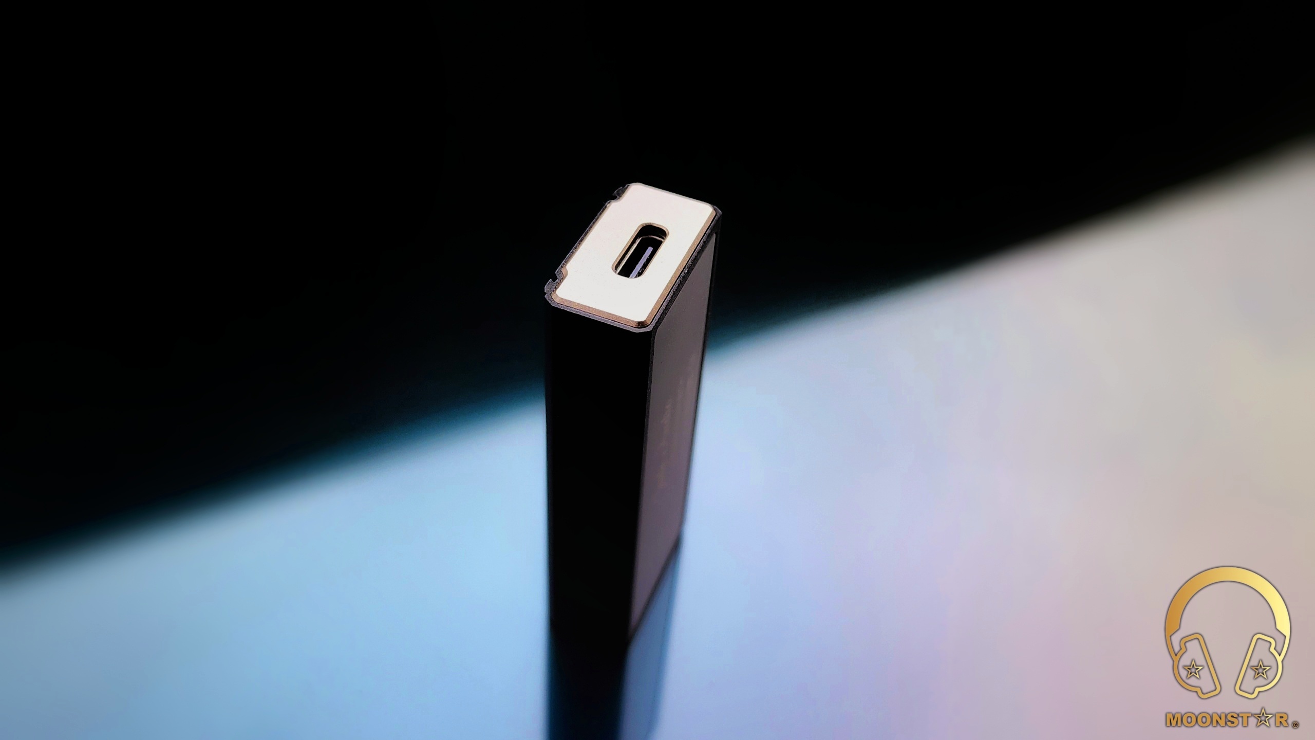 The rear surface features the USB Type-C digital interface that is located right at the center of a metal plate in gold color.