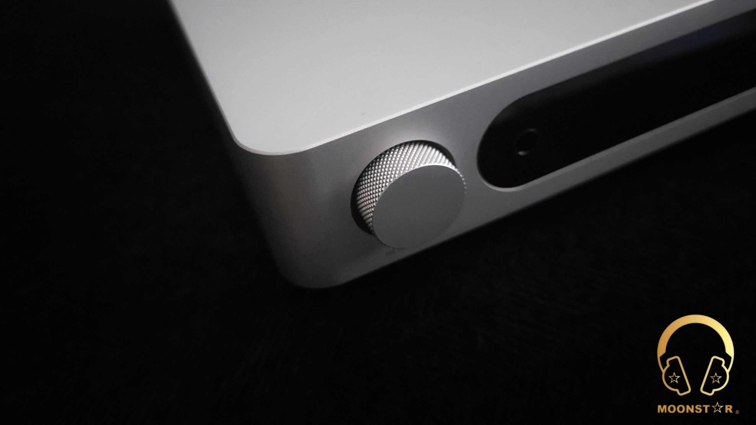 Physical controls consist mainly of two rotary encoders: the Menu Knob is placed on the left for settings navigation, and the larger Volume Knob is located on the right for output level adjustment.