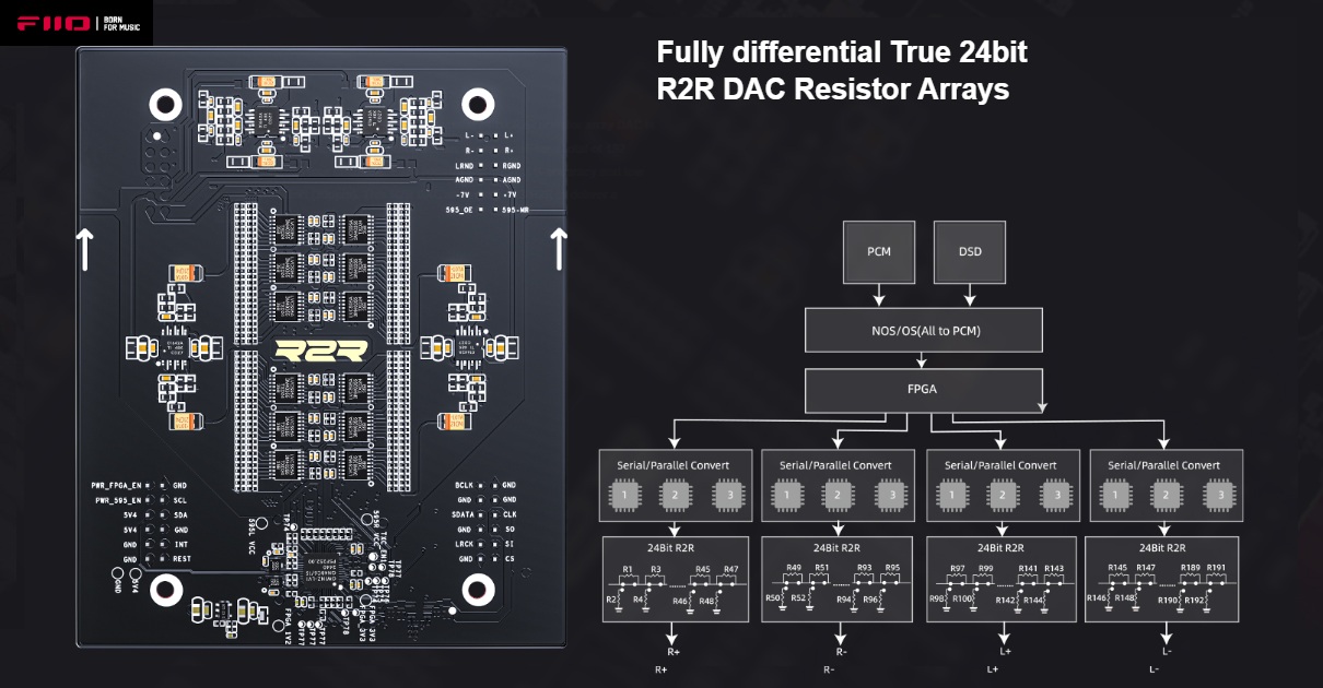 - DAC: Fully differential true 24Bit R2R DAC resistor arrays