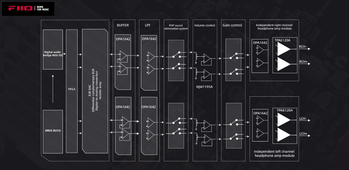 The amplification stage of the K13 R2R is configured to drive demanding headphones. It utilizes dual OPA1642 op-amps in the Low-Pass Filter (LPF) stage and dual TPA6120A chips for the final headphone amplification. This setup allows the unit to achieve a balanced output of 2400 mW into a 32Ω load (4.4mm BAL). This high-current capability is essential for effectively driving both high-impedance headphones and current-hungry planar magnetic models. The high power ensures challenging headphones maintain control and dynamic response. However, I would wish that FiiO had included an XLR balanced output beside the 3.5mm SE and 4.4mm BAL.