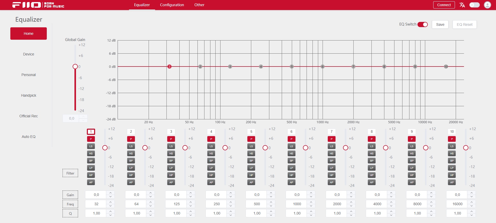 Unlike standard graphic equalizers, the PEQ offers a comprehensive tool for precise sound tuning. It allows the user to adjust the center frequency, gain (boost/cut), and Q-factor (bandwidth) for each of the ten bands. This level of granular control is useful for correcting known frequency response deviations in coupled headphones or for adapting the sound signature to match personal preferences.