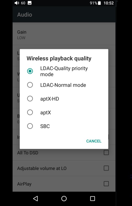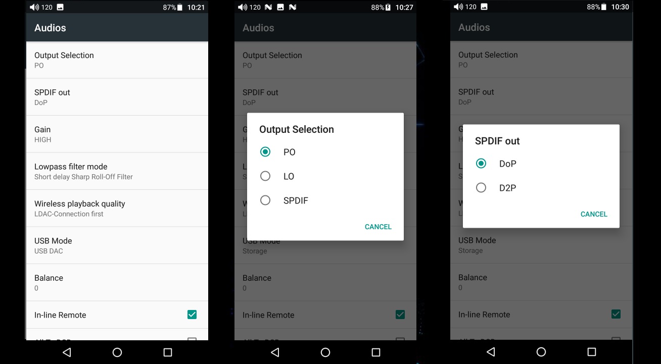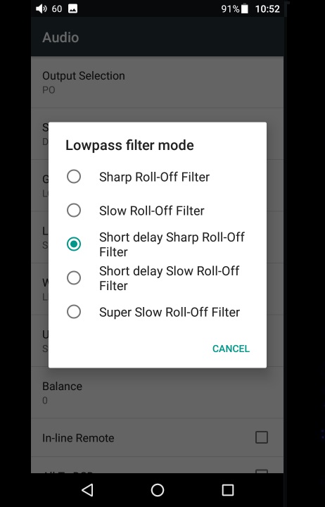 The Audio Settings Menu is showing some settings like Low Pass Filter Modes, Wireless Playback Quality, USB Mode (USB DAC/Storage), Low/High gain, Digital Filters, Balance, etc.