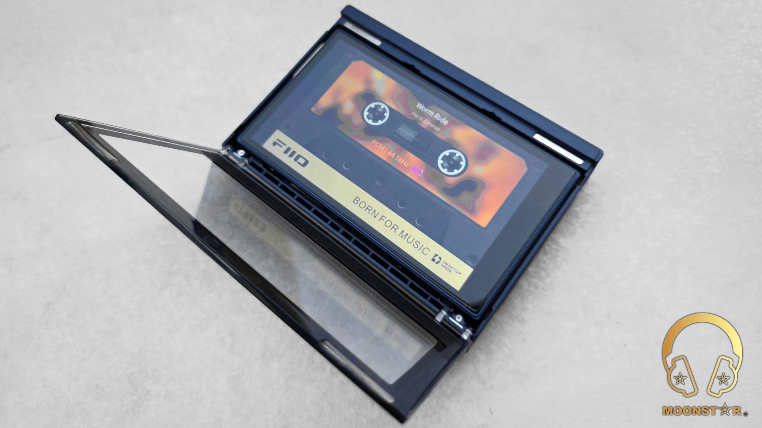 The device also offers a unique Cassette Mode interface. When used with its dedicated case, the screen automatically shifts to a landscape view featuring a cassette tape with animated cogs, displaying current track information. The interface can be controlled via a button on the case, which also allows temporary access to the main operating system.