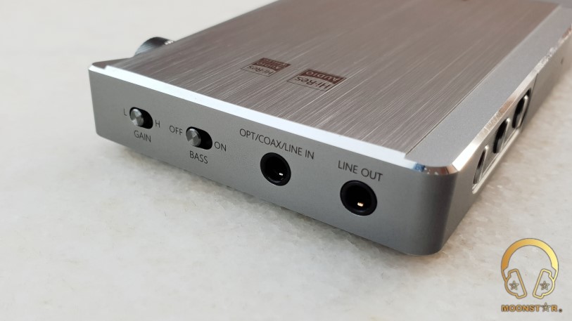 Right next to the optical/coaxial out is the analog line out interface (AUX) of the FiiO Q5s which has a Frequency Response of 5 Hz~90 kHz and THD+N of 0.001% (1 kHz).