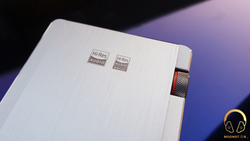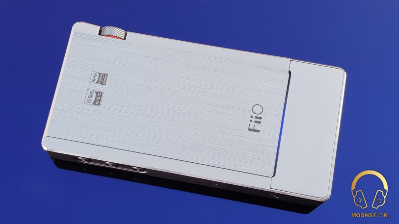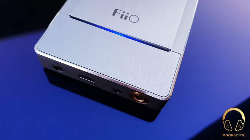 On the top of the device is a metal panel which shows the FiiO brand logo and the Hi-res Audio & Hi-Res Wireless certifications. Here is also a Bluetooth LED indicator that that lights up in different colors for example blue for SBC, yellow for aptX HD or white for LDAC, etc.