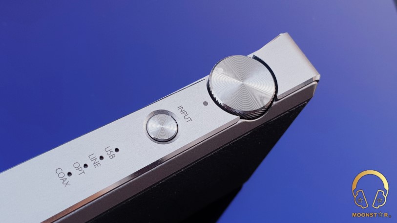The left side of the FiiO Q5s sports the multifunctional Power on /off and volume adjustment wheel. Here are also the input button and 4 LED indicators where you can see the actual input selections which are USB, Line, Optical and Coaxial. These indicators can also display the battery and charging status of the Q5s if you hold the input button for 3 seconds.