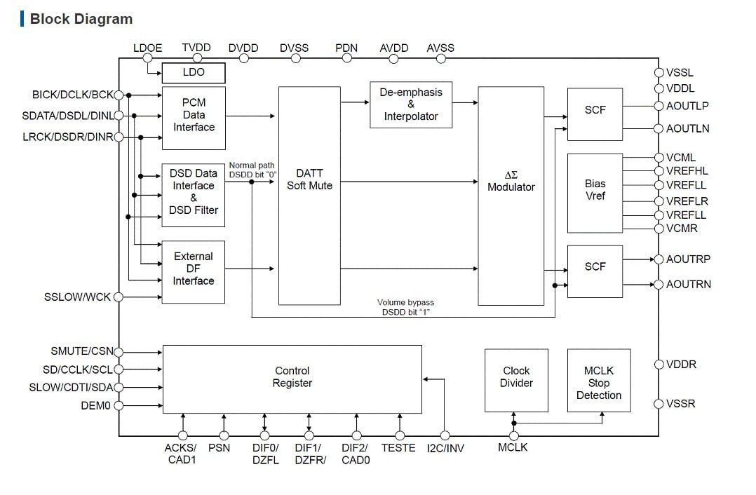 The AK4493EQ integrates a newly developed switched capacitor filter “OSR Doubler”, making it capable of supporting wide range signals and achieving low out-of-band noise while realizing low power consumption. Moreover, the AK4493EQ has six types of 32-bit digital filters, realizing simple and flexible sound tuning in wide range of applications. The AK4493EQ accepts up to 768kHz PCM data and 22.4MHz DSD data.