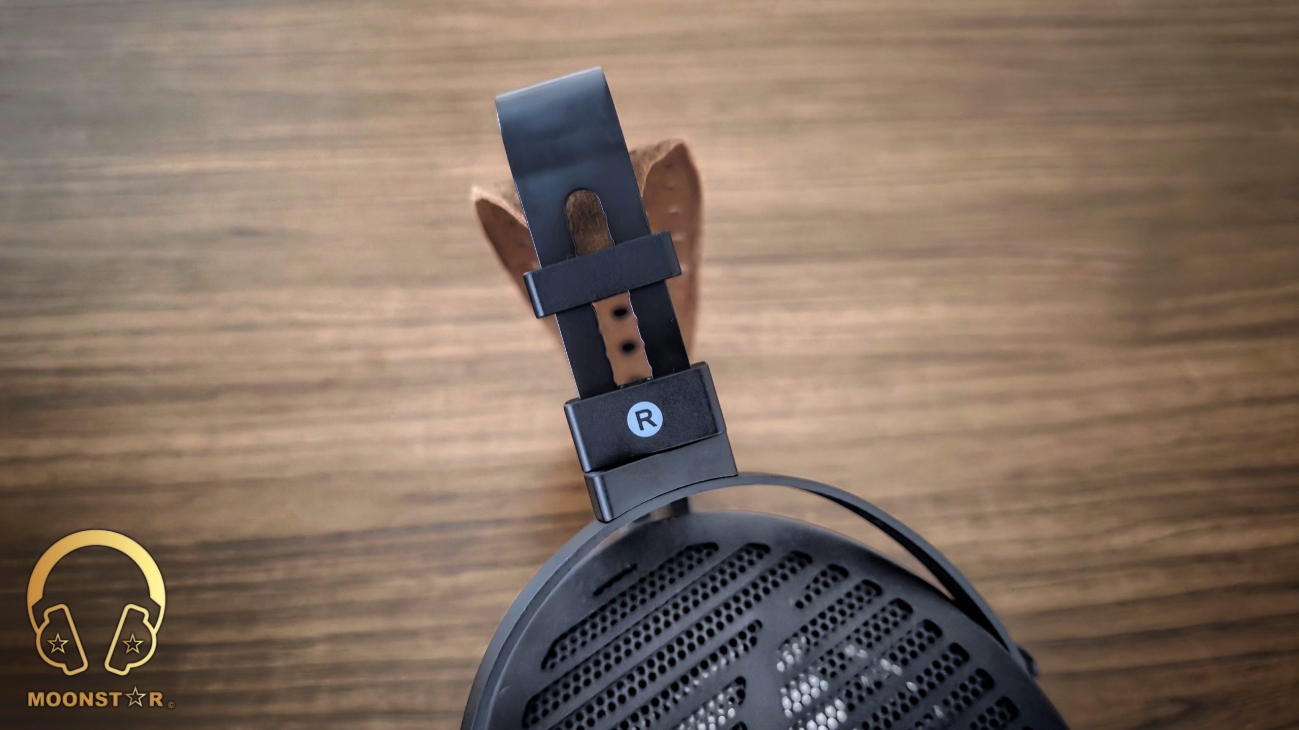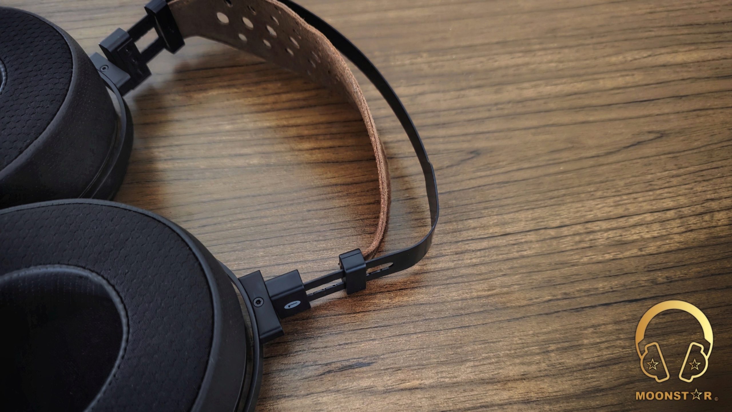 The headband uses a memory metal core encased in genuine suede leather, offering a flexible yet durable fit that retains its shape after adjustments. The stepless silicone adjustment slider provides a smooth, damped mechanism for precise fit customization, though it can feel slightly stiff initially.