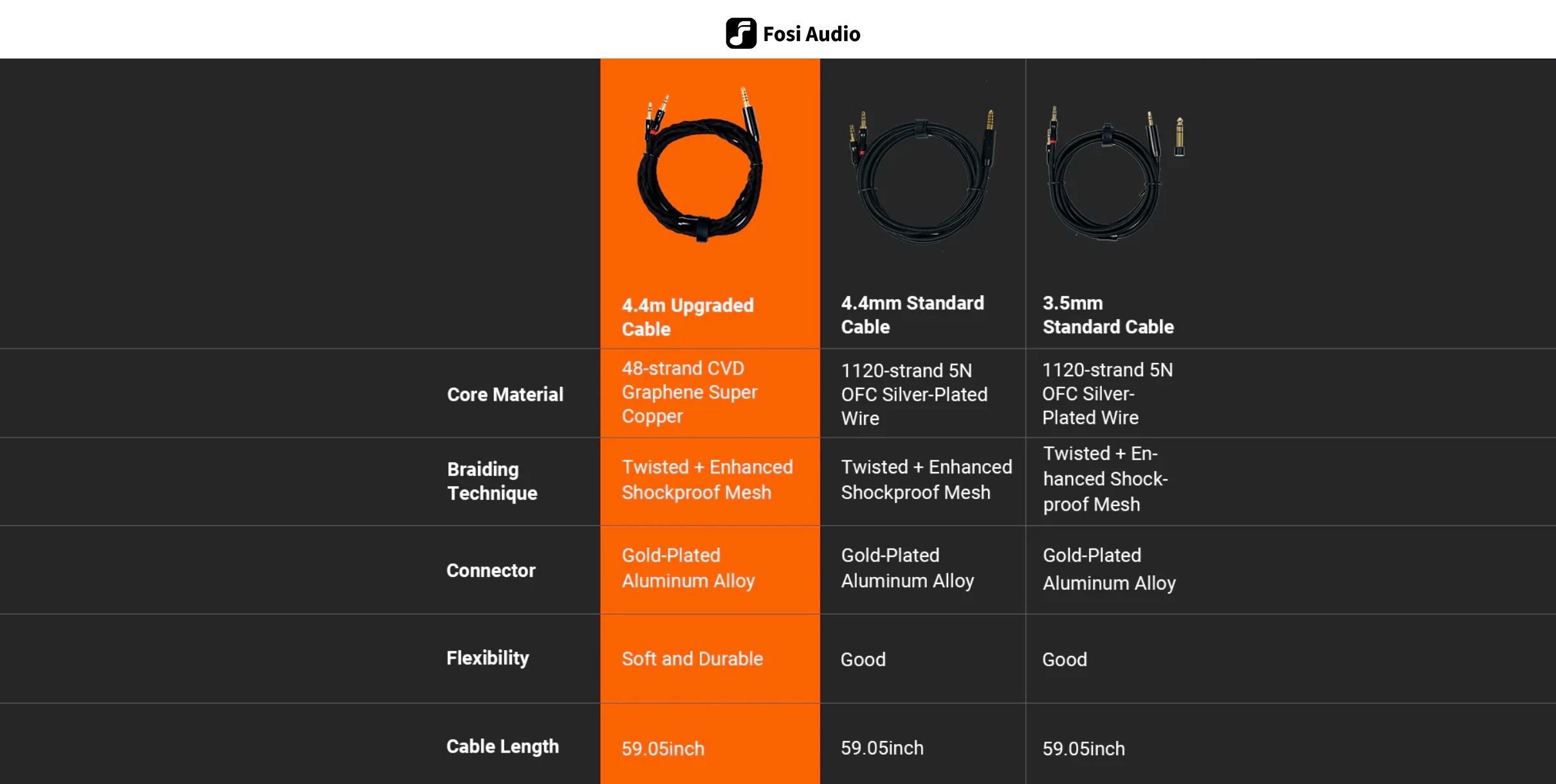 Additionally, another optional 4.4mm upgraded cable is available. This cable is made from 48-strand CVD Graphene Super Copper, featuring a twisted + enhanced shockproof mesh braiding and gold-plated aluminum alloy connectors. This option offers enhanced flexibility, described as “Soft and Durable,” for improved signal integrity and a more premium feel.