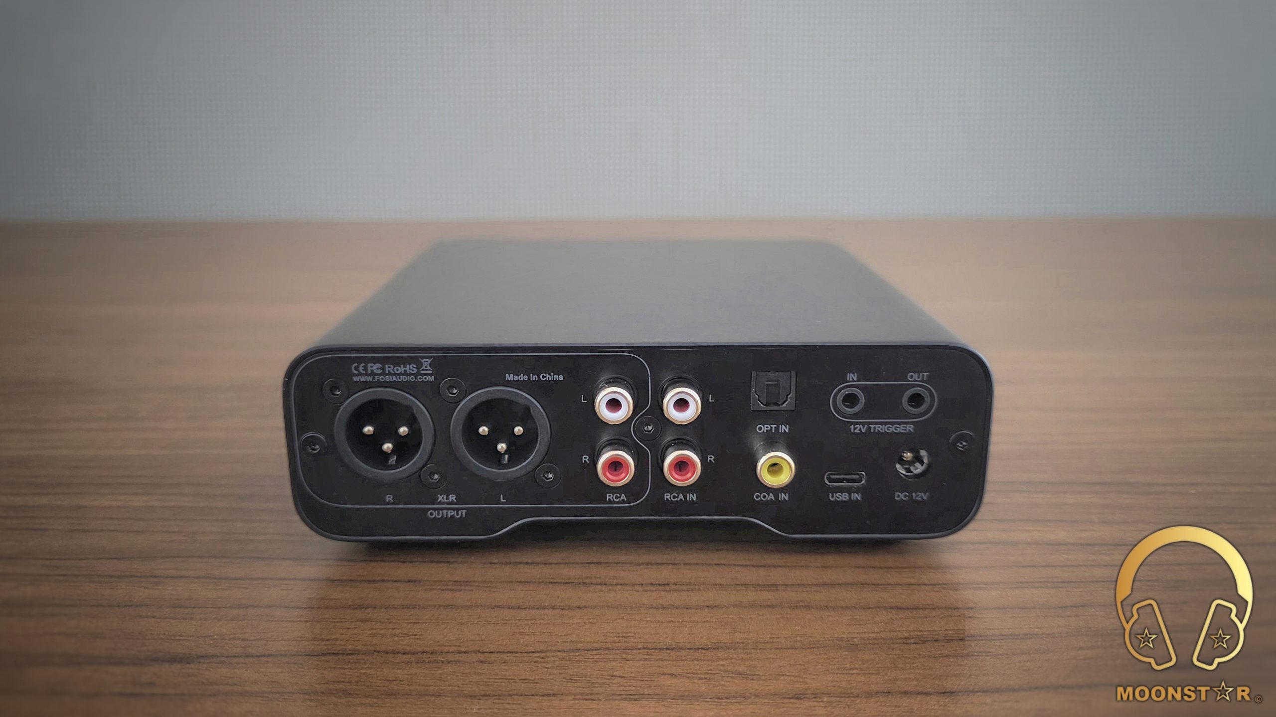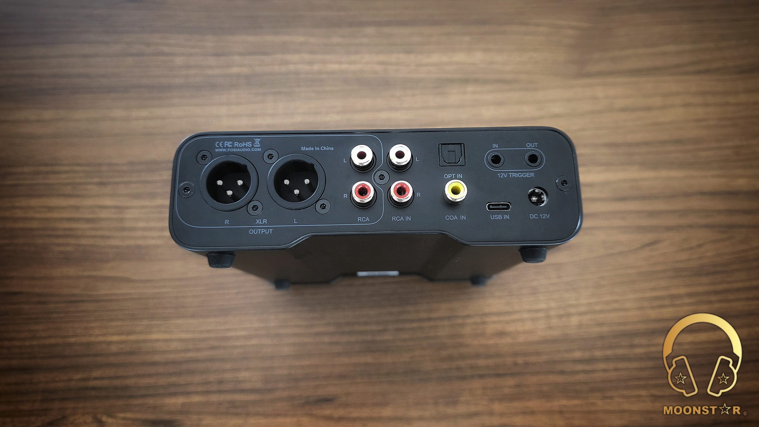The rear panel is designed for connectivity, featuring a DC 12V power input on the left, followed by a 12V trigger in/out port for system integration. Next are the digital inputs: a USB-C port, an Optical input, and a Coaxial input, all clearly labeled. To the right, RCA line-in and line-out ports support analog connections, while XLR balanced outputs cater to preamp use.