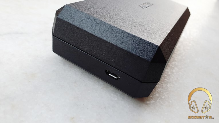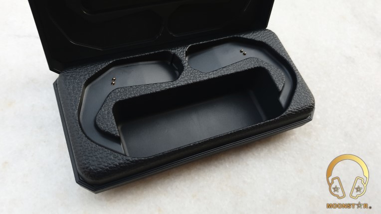 The Fostex TM2 comes with a charging case/cradle which has dimensions of W138×D67×H35 and that weights 128g (except the TM2). The cradle is made of plastic and has a fine textured surface.