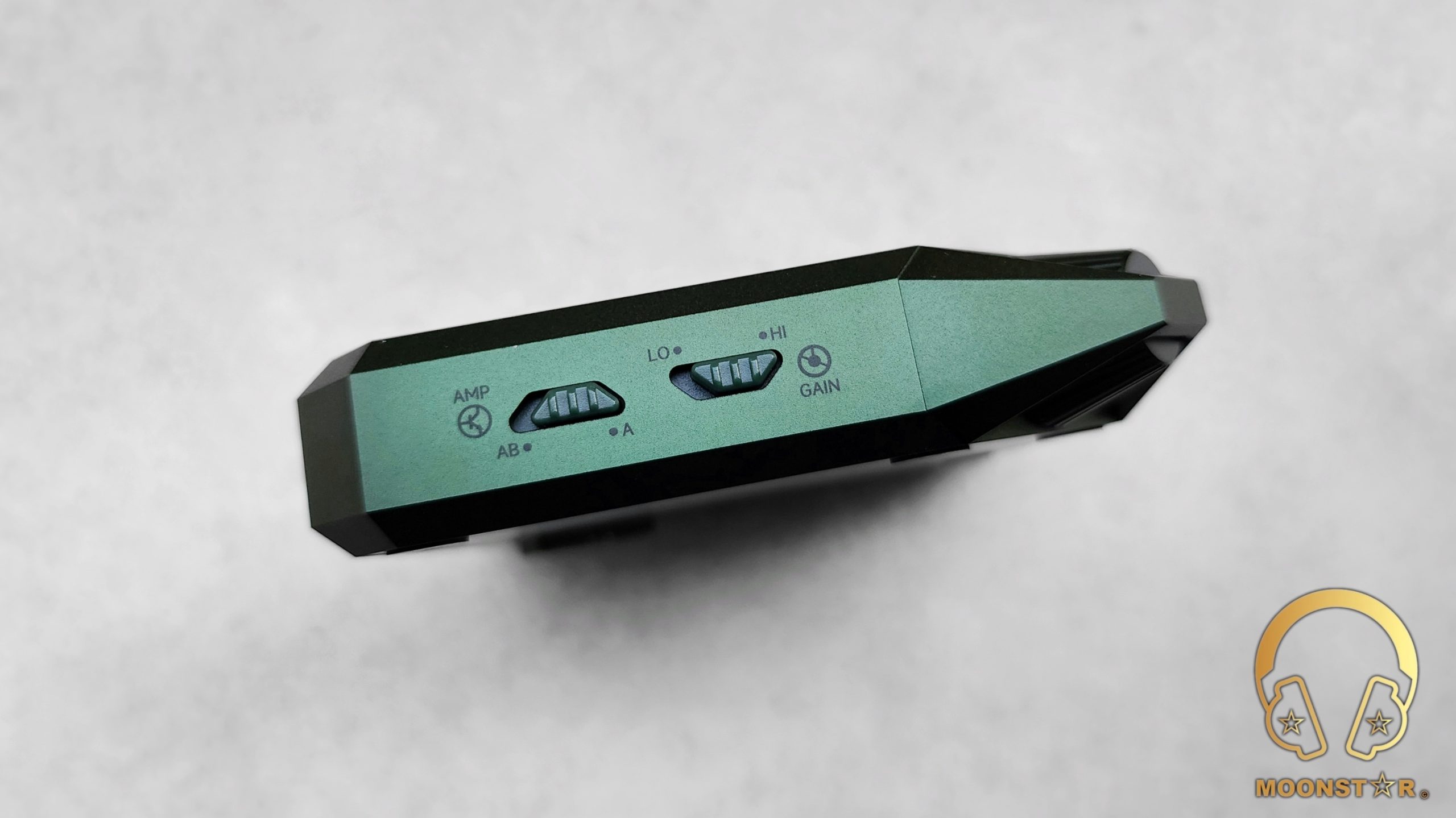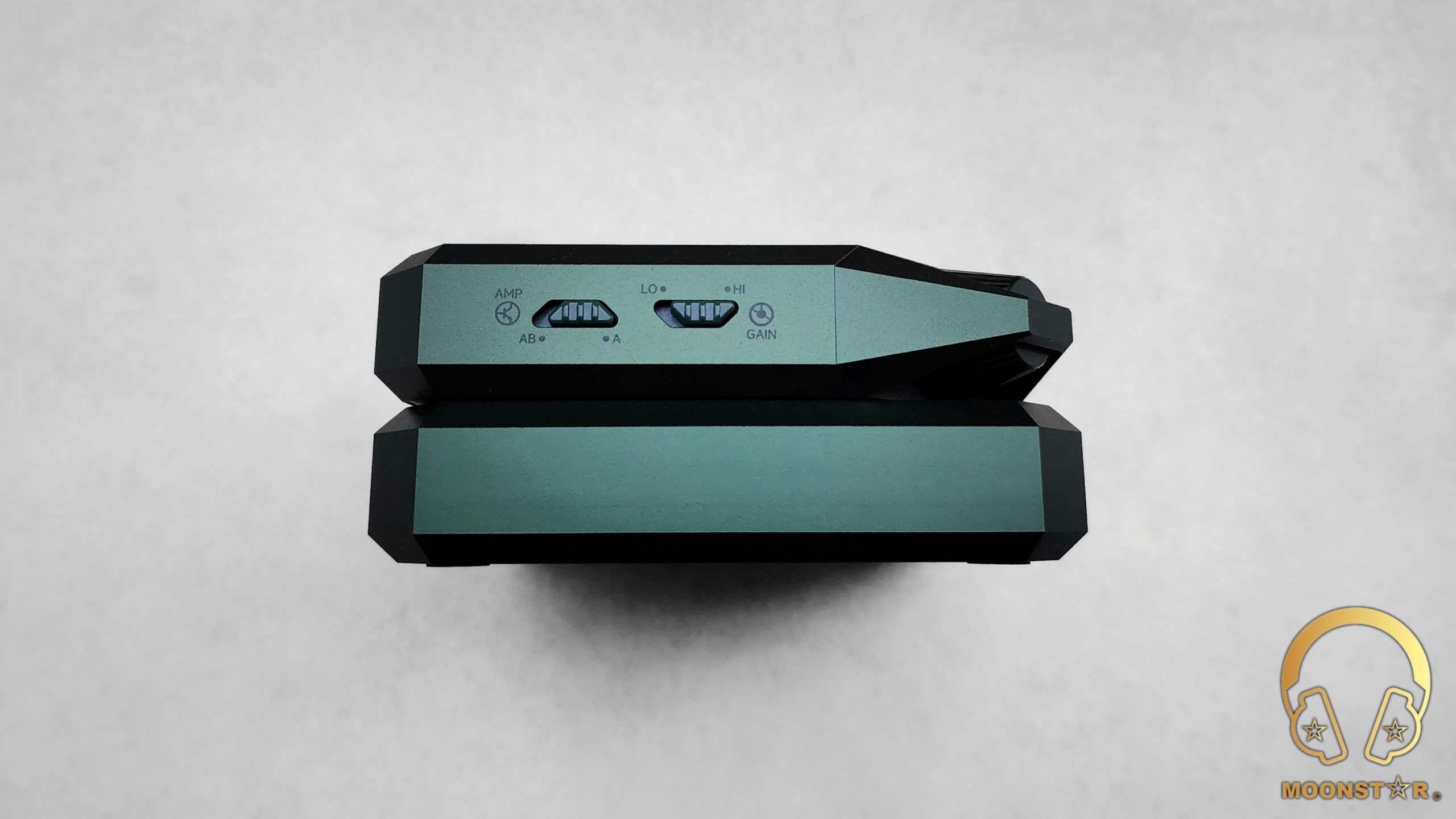 The left surface of the DAC/AMP unit features two small switches designed to enhance user control and versatility. The first switch allows users to toggle between Class A and Class AB amplification modes, while the second switch offers the option to adjust gain levels between Low and High, enabling users to optimize amplification for various headphone sensitivities, ensuring optimal performance and listening experience.