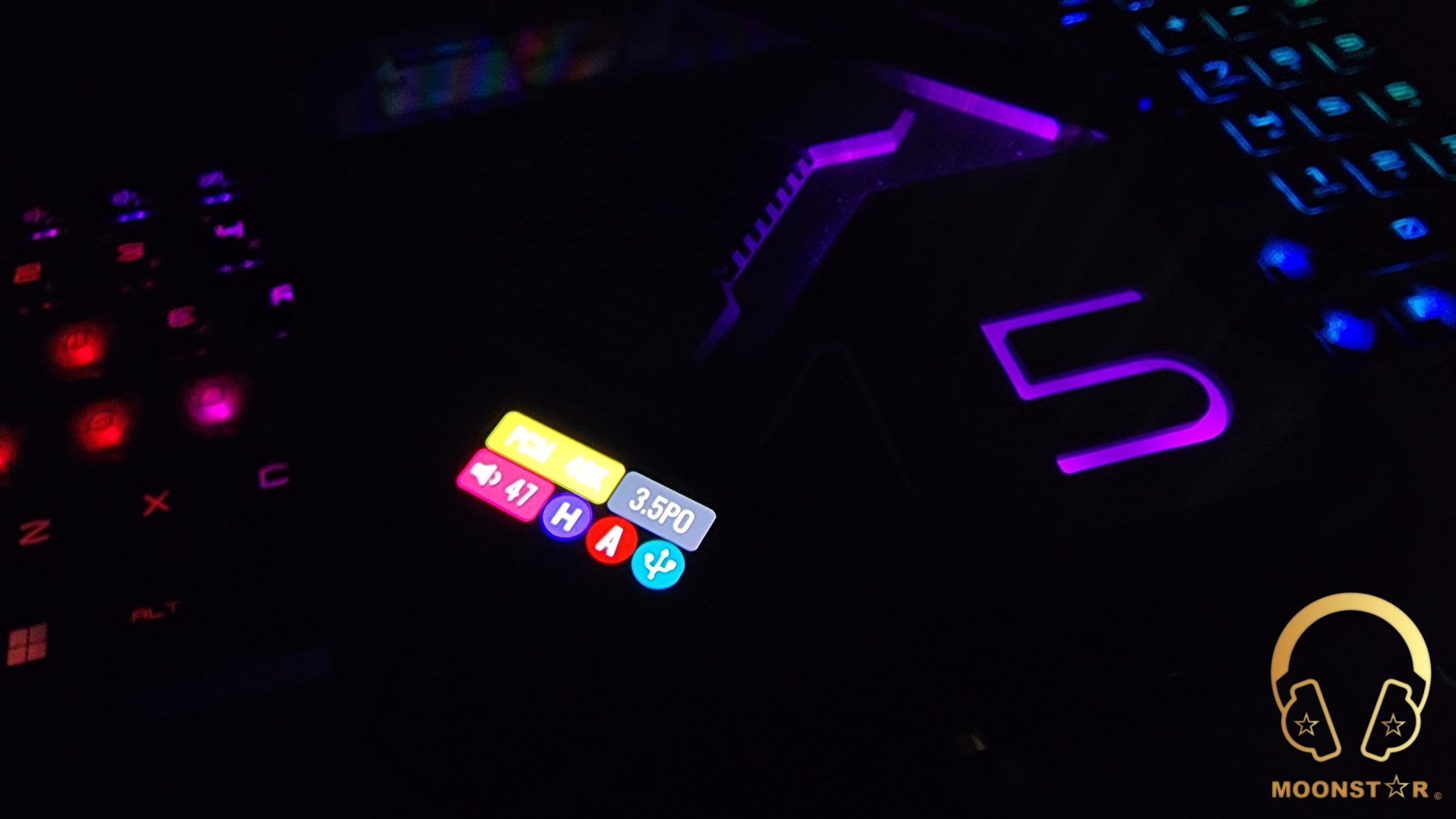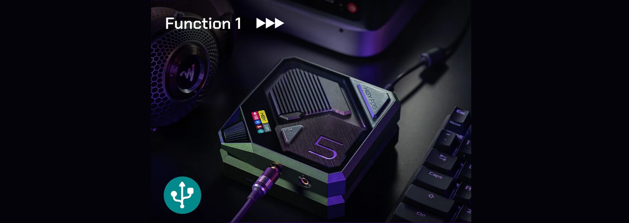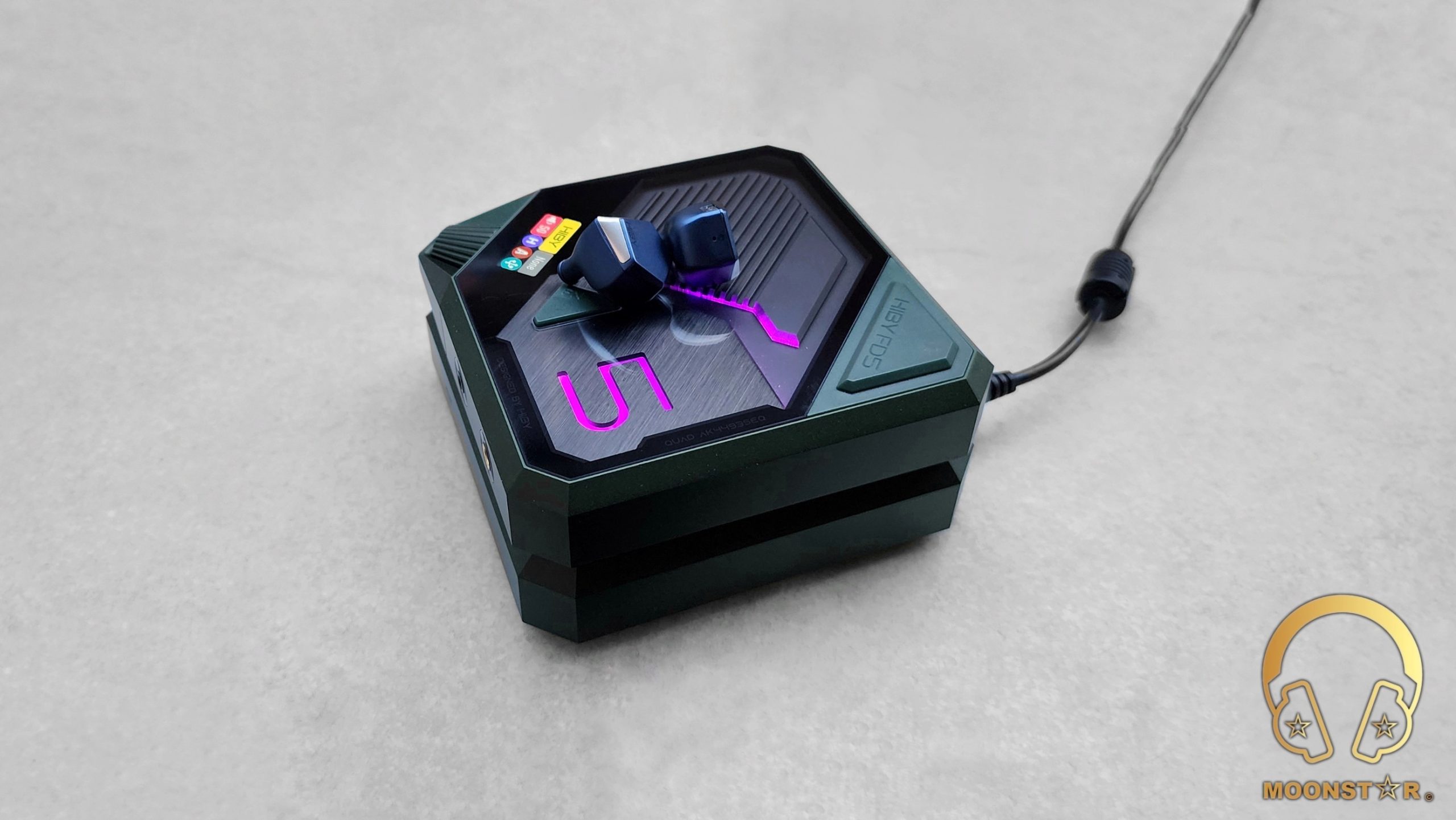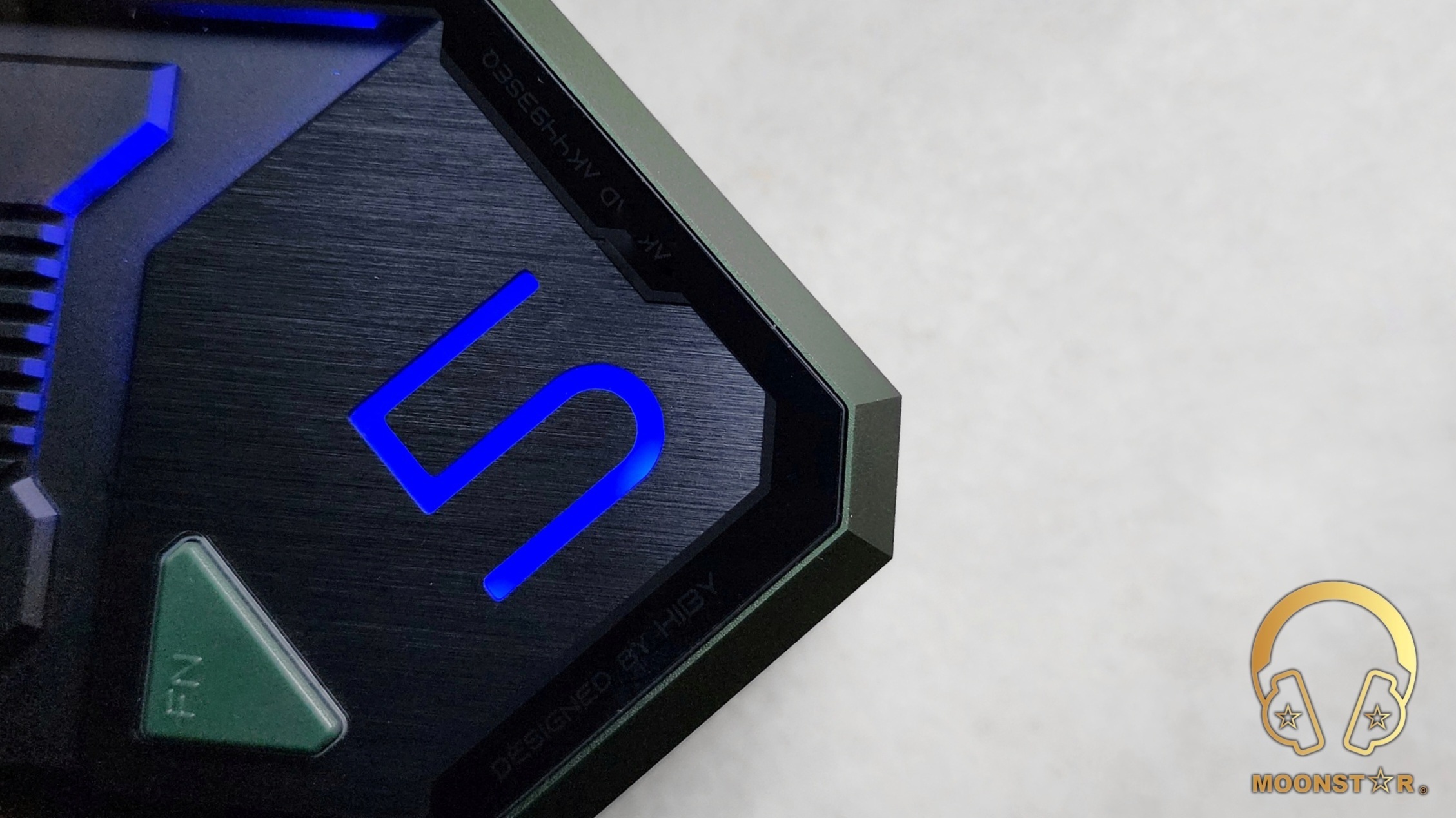 The DAC/Amplifier unit features a transparent glass panel with the letter “5” for the FD5 model description. This letter lights up in purple in USB mode and blue in Bluetooth mode. You can select between these modes using the FN button.