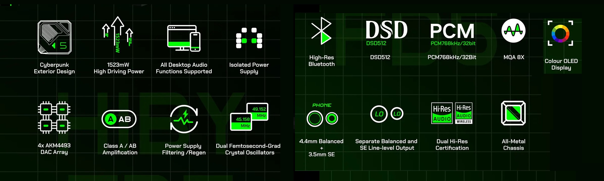 The FD5 is a multifunctional desktop DAC/Amplifier and Bluetooth receiver with an eye-catching Cyberpunk Exterior Design. This design, inspired by Cyborg aesthetics, reflects HiBy’s new design philosophy called “New Generation Audio Evangelism.” It features bold, angular lines and futuristic shapes.
