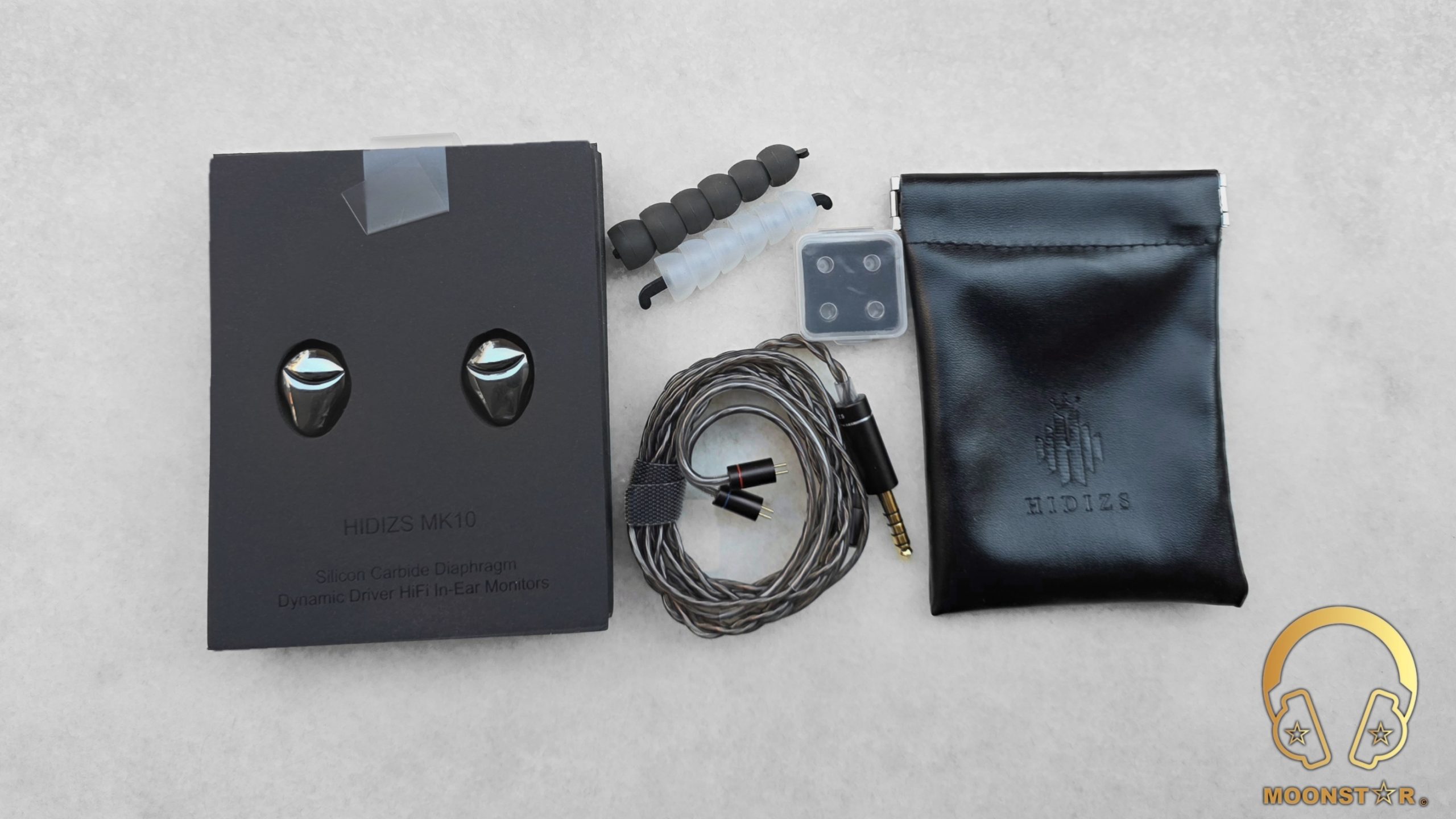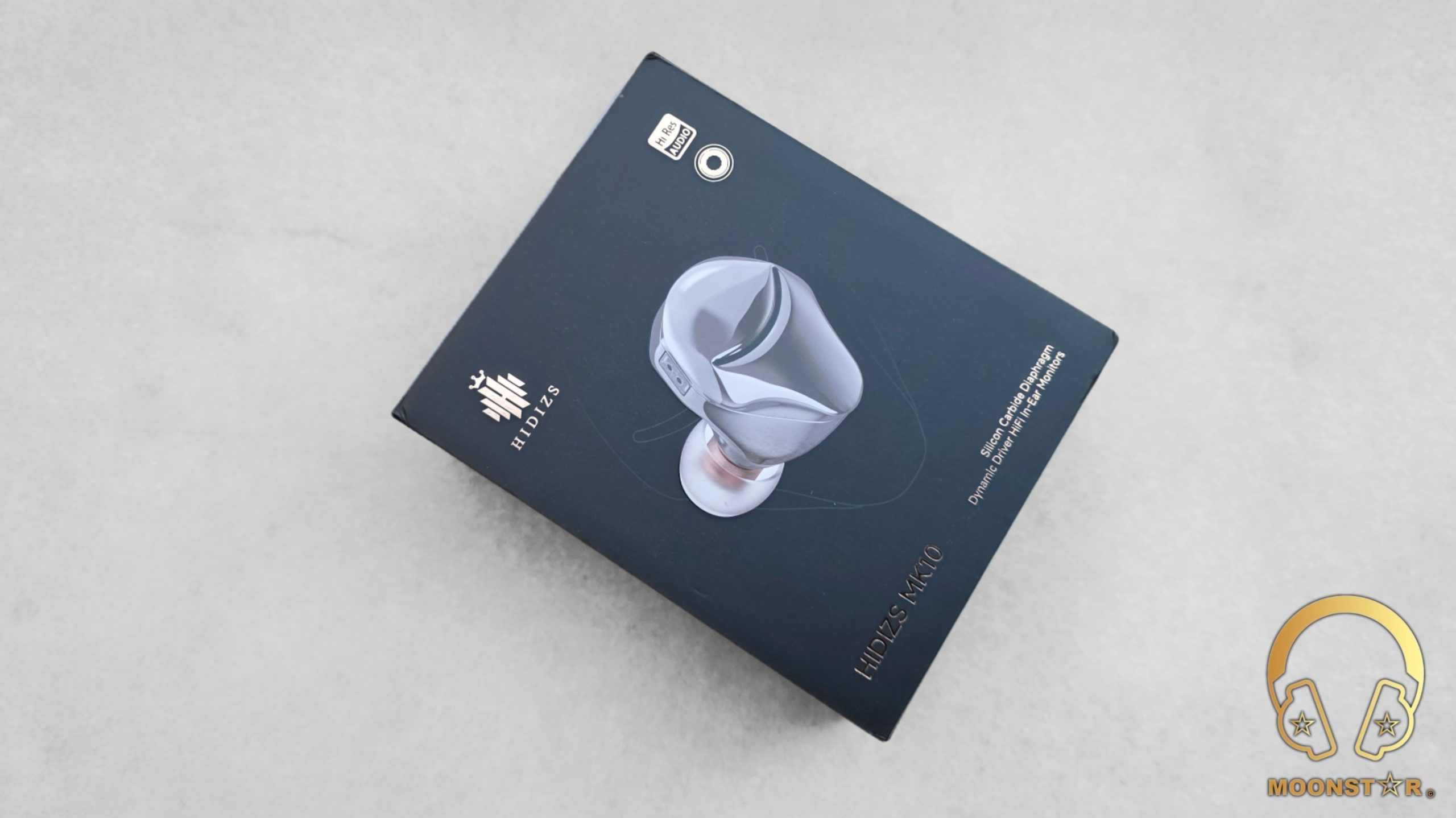 The HIDIZS MK10 ArcSonic is packaged in a sleek, black box. It has a smooth finish with the HIDIZS logo printed on the lid and a detailed illustration of the IEMs on the front, with key specifications listed on the rear surface.
