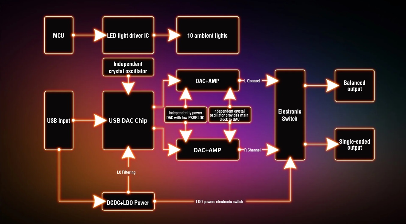 The 3.5mm SE output offers up to 78mW @ 32ohm per channel, while the 2.5mm Balanced output is even more powerful with up to 195mW @ 32ohm per channel. Another highlight of the analog interfaces is the pretty clean output that shows minimal background noise.
