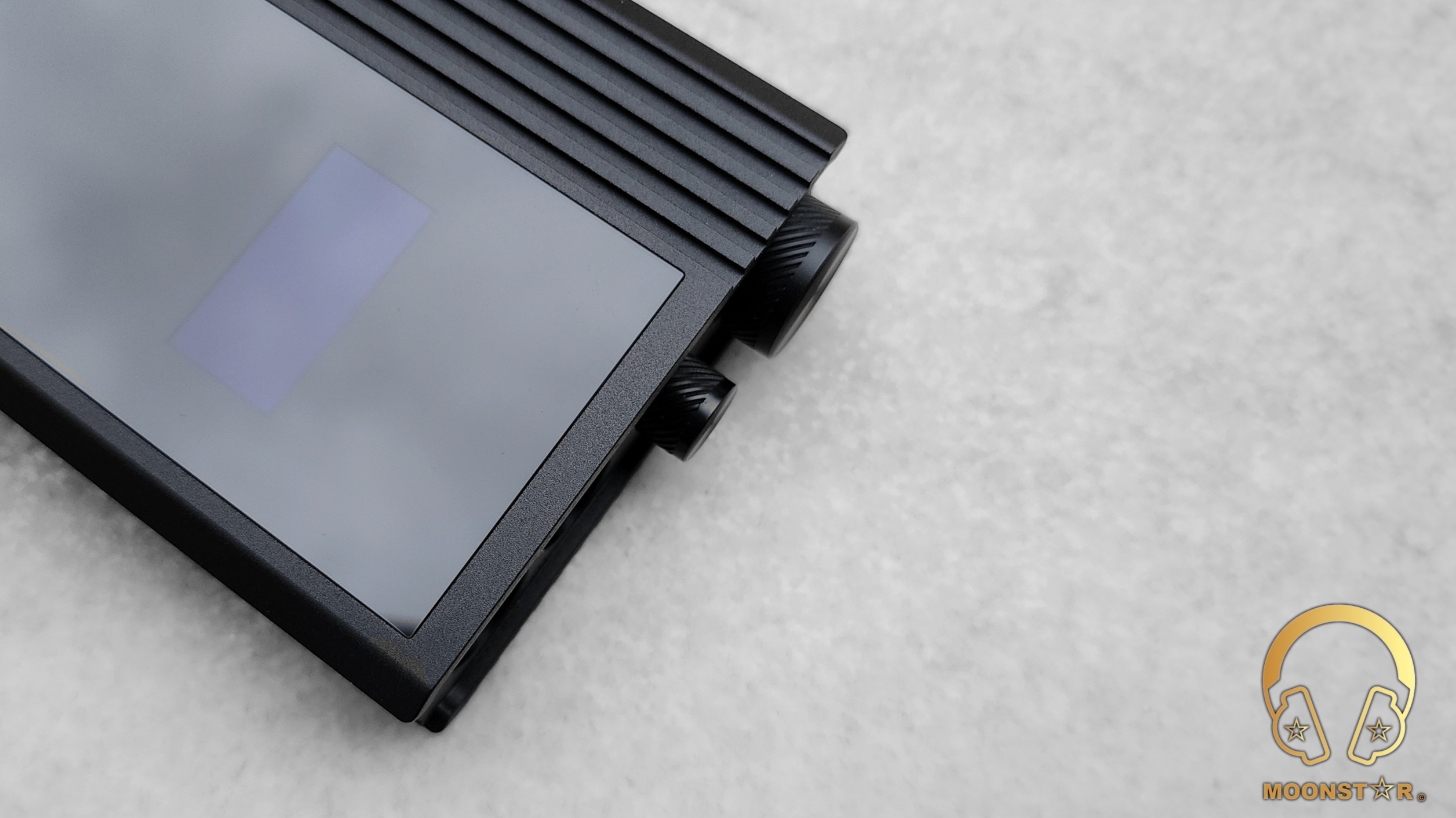The front panel of the device is equipped with two headphone jacks located on the left side. A 4.4mm Balanced Headphone output and a 3.5mm Single-Ended Headphone output are both available. These outputs can also function as line outputs for connecting to speakers or amplifiers.