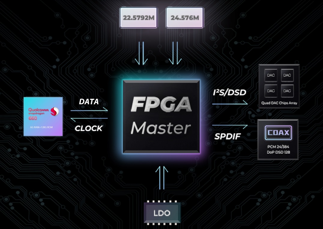 In the DX300, we adopted an in-house developed FPGA-Master technology. The FPGA-Master, as the audio system controller, directly requests audio data from the SoC, and plays a major role in signal reproduction and maintaining signal integrity. It synchronizes and generates all audio clocks at the same time utilizing two Accusilicon femtosecond oscillators, to achieve a fully synchronized single clock source. The FPGA and oscillators also reduce jitter to an extremely low level, building a clean digital audio signal.