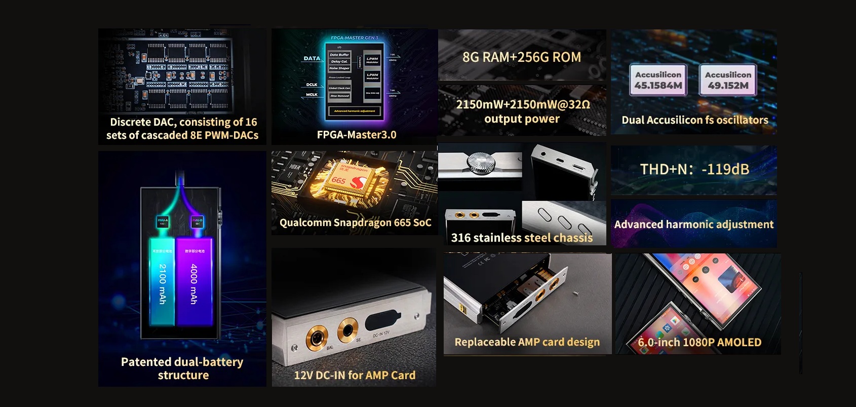 The DX340’s user interface is powered by an open Android 13 system, a Snapdragon 665 processor, 8GB of RAM, and 256GB of internal storage. Audio processing is handled by iBasso’s proprietary FPGA-Master 3.0 precision audio system controller. The device utilizes a 16-group, 8-element 1-Bit Discrete PWM DAC cascade, with 32 elements per channel for L+, L-, R+, and R-. This configuration, along with a rated maximum power output of 2150mW @ 32 Ohms per channel, aims to provide a powerful and stable sound output.