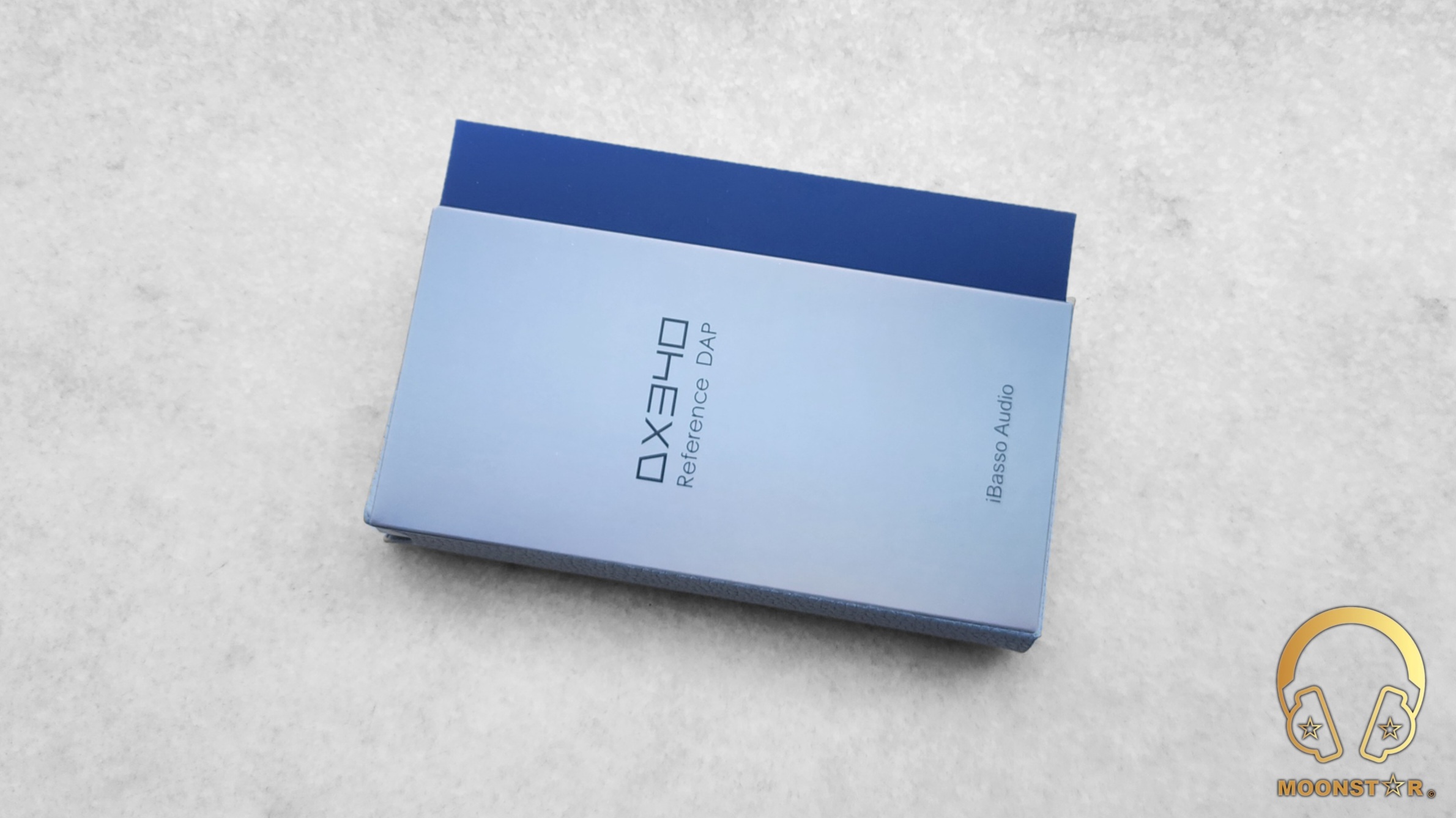 The packaging of the iBasso DX340 digital audio player features a distinctive iridescent finish on the grey sleeve that changes color under different lighting conditions. This unique design element adds visual interest to the box. Once the sleeve is removed, it reveals the main blue box, which prominently displays the iBasso branding on the top. The front of the sleeve displays the model number “DX340” in a bold, modern font, along with the words “Reference DAP” and the brand name “iBasso Audio” in a clean, minimalist font.