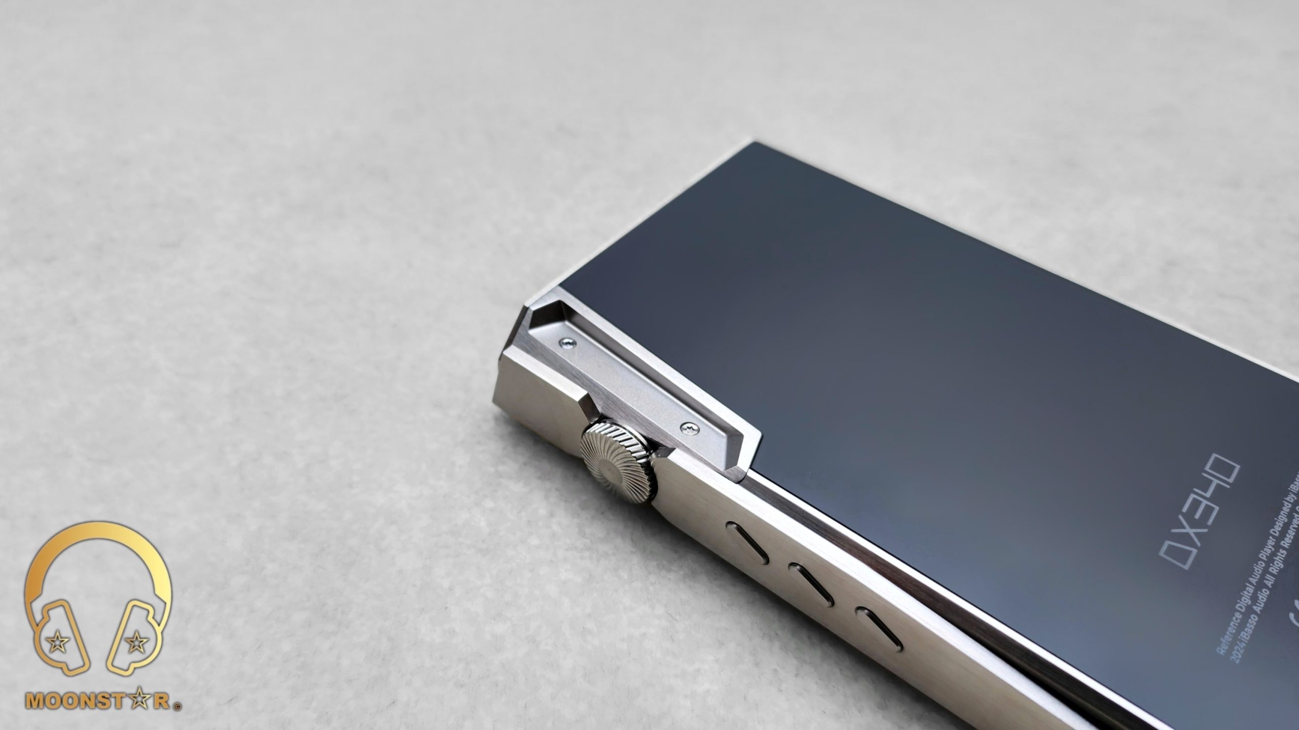 On the right side of the DX340, the design focuses on usability and ergonomics. The multi-functional volume wheel is a standout feature, serving dual purposes: it allows users to adjust the volume and, when pressed, can turn the screen on and off. The wheel has a textured, ridged surface that provides a comfortable and precise feel, making it easy to grip and operate. The intricate design, with its radial pattern and precise machining, showcases the attention to detail and craftsmanship.