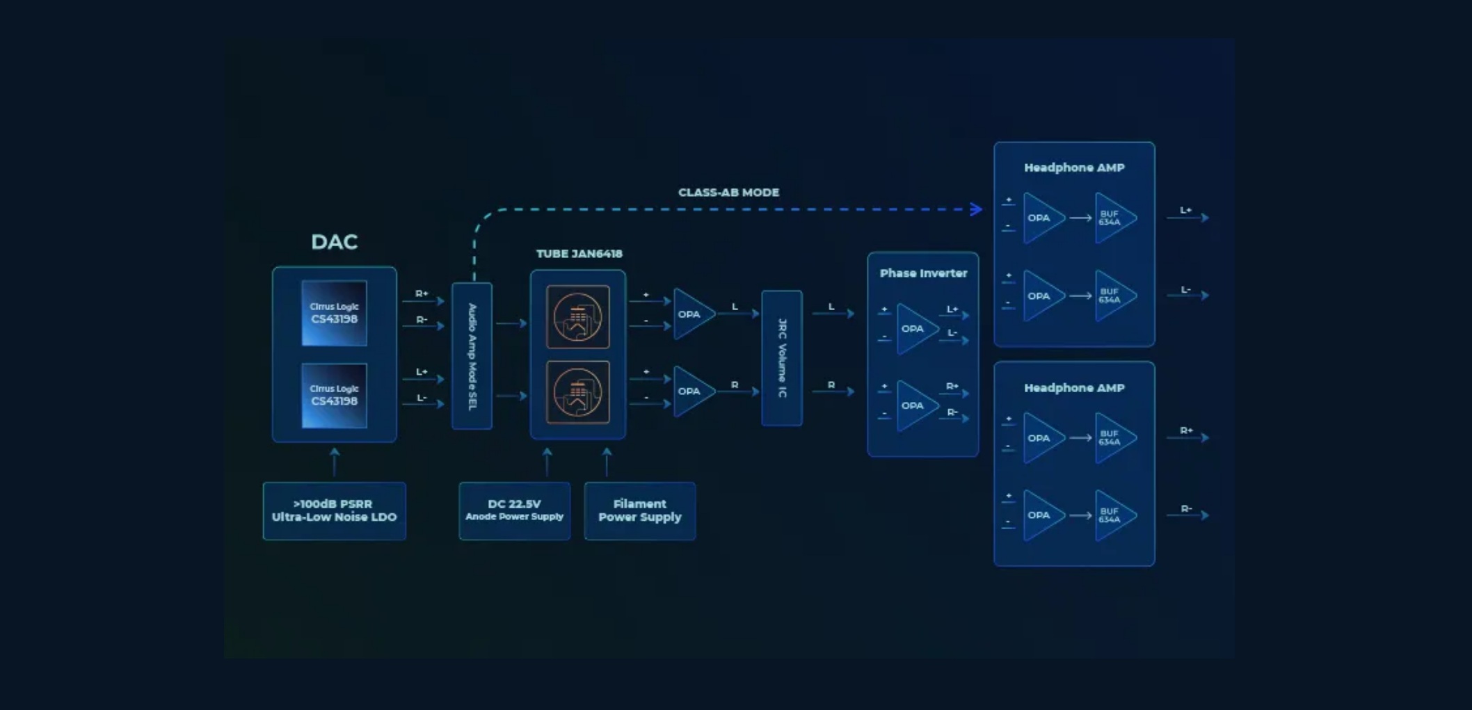These work in tandem with a hybrid amplification system that lets you switch between tube and Class AB modes. In Tube mode, the dual Raytheon JAN6418 vacuum tubes, powered by a dedicated 22.5V supply, provide a rich, textured sound. When I switch to Class AB, I get a clean, punchy output with a signal-to-noise ratio (SNR) hitting 130dB, which drops to 107dB in Tube mode due to its warmer character.