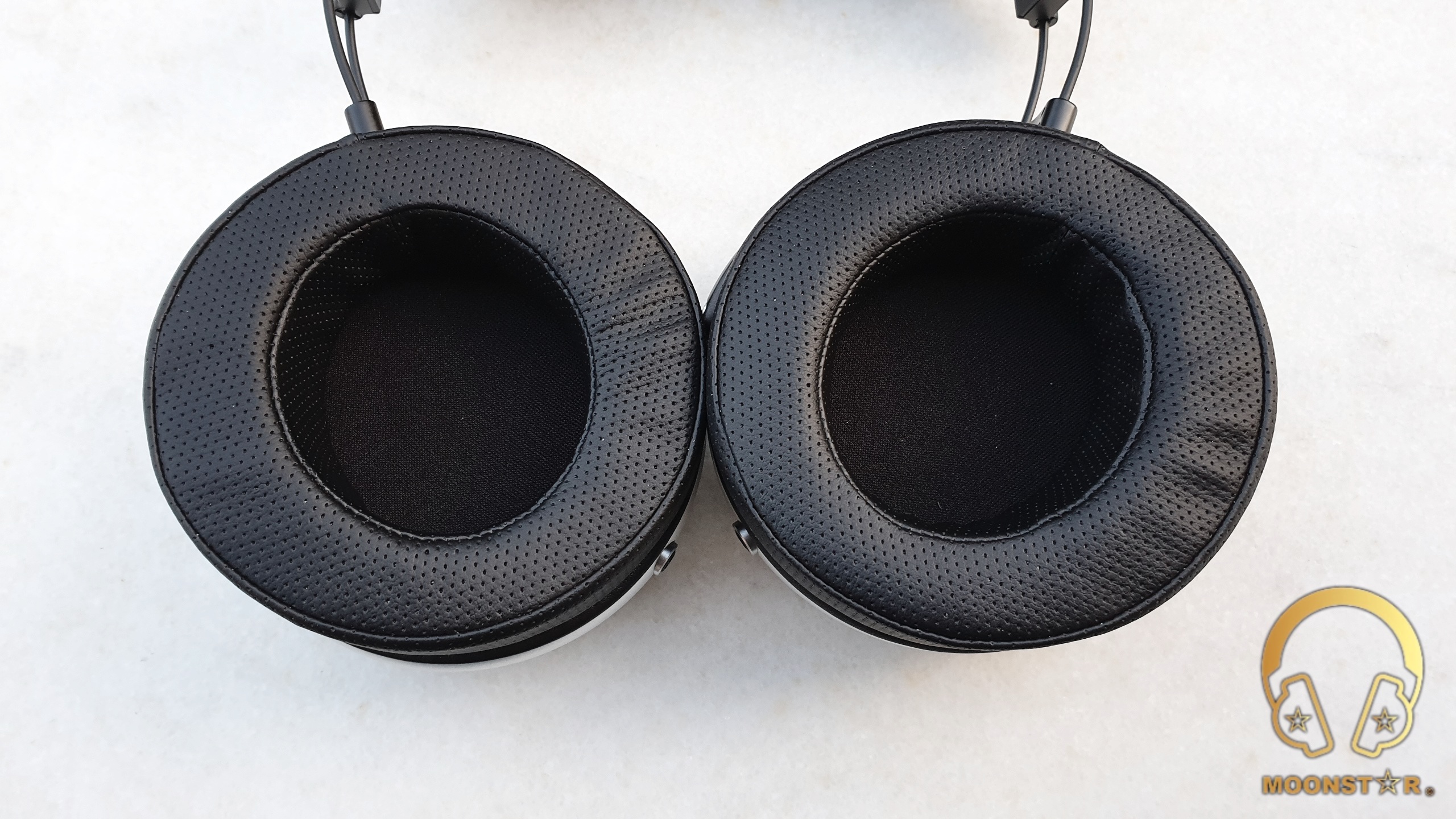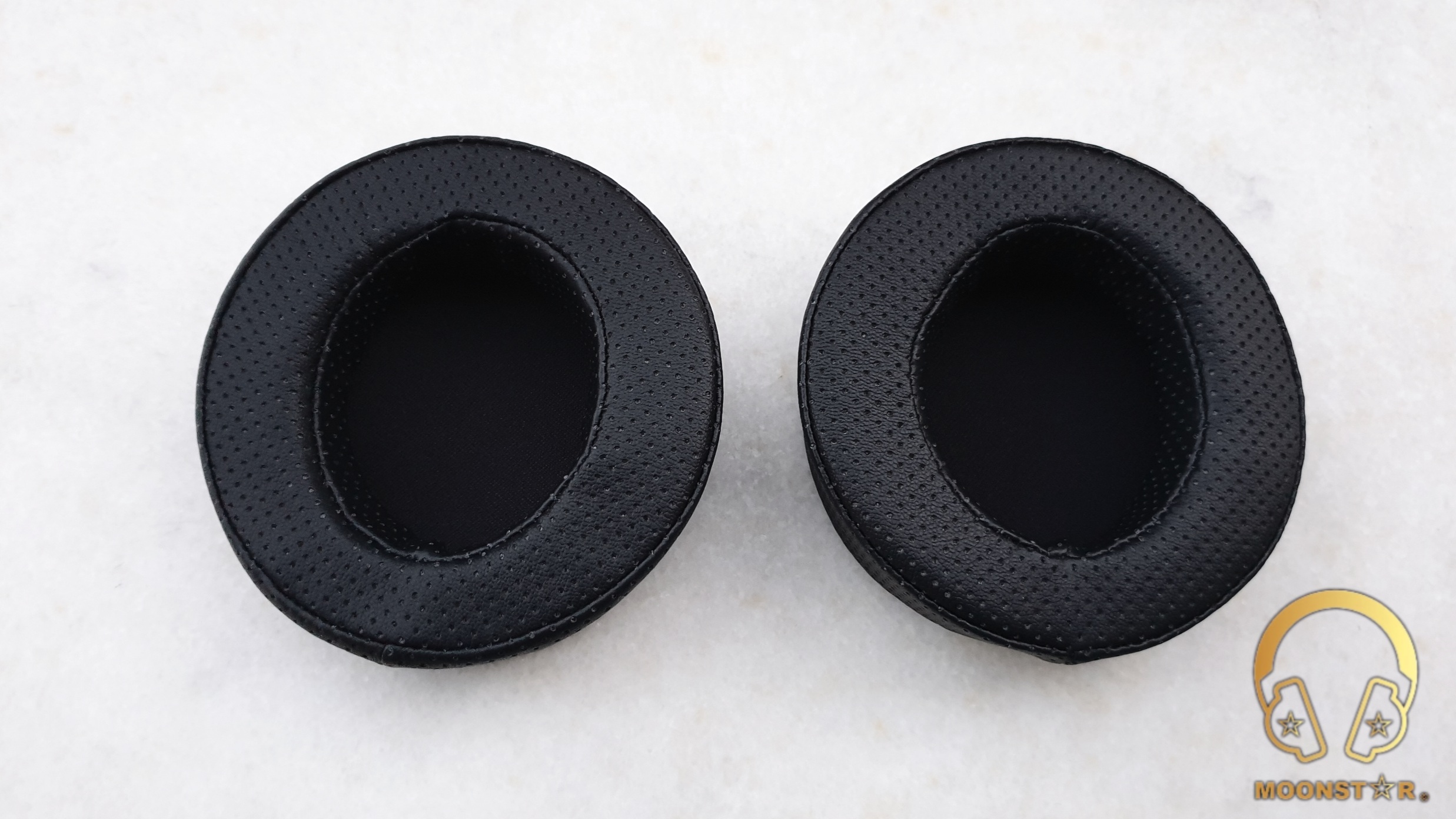 The earpads are user replaceable and do have a pleather surface in black color. The earpads have an angled design which has a bump on the rear side.