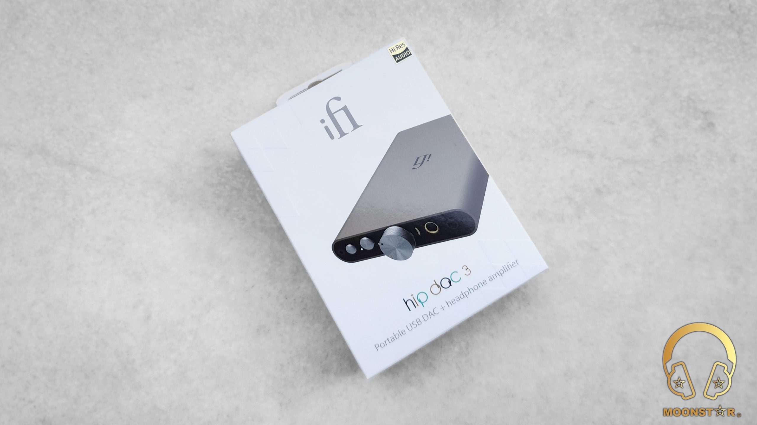 The iFi Audio hip-dac 3 comes in a relatively small rectangular box featuring an illustration of the device and some product-related branding on its surface.